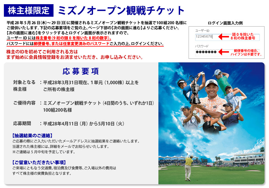 【株主様限定】2016年ミズノオープン観戦チケットプレゼント お申込みページ