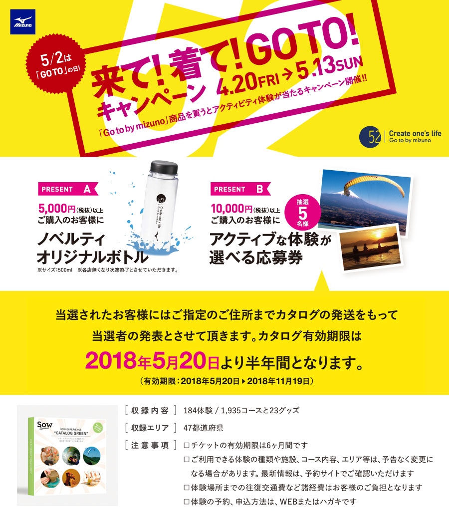 2018年4月20日〜2018年5月13日迄の期間中、ミズノ公式オンラインショップでGo to by mizuno商品を10,000円(税抜)以上ご購入のお客様は、こちらの専用応募ページからお申込み下さい。