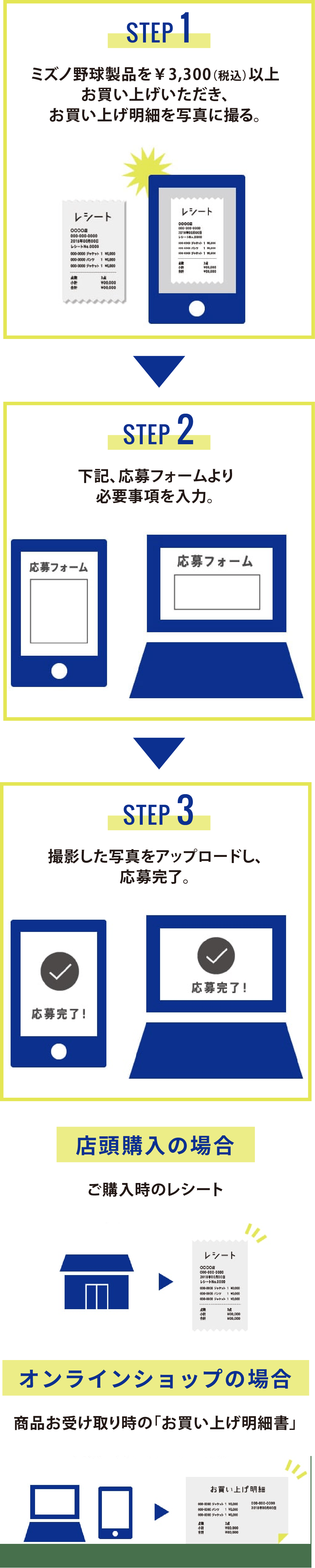 期間中、ミズノ野球製品を¥3,300(税込)以上ご購入いただいた「レシート」および「お買い上げ明細」を撮影し、応募フォームへ必要事項(氏名・メールアドレス・電話番号など)をご入力の上、撮影画像をアップロードしてご応募ください。