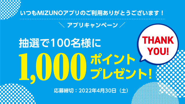 MIZUNOアプリのアップデートに伴いまして、MIZUNOアプリ限定キャンペーンとして「100名様にミズノ公式オンラインシップやミズノ直営店でご利用いただける1,000ポイントをプレゼント!」を実施いたします!