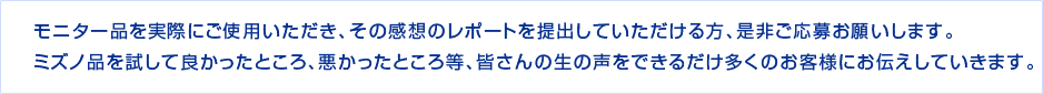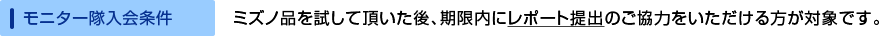 ・ミズノ品を試して頂いた後、期限内にレポート提出のご協力をいただける方が対象です。