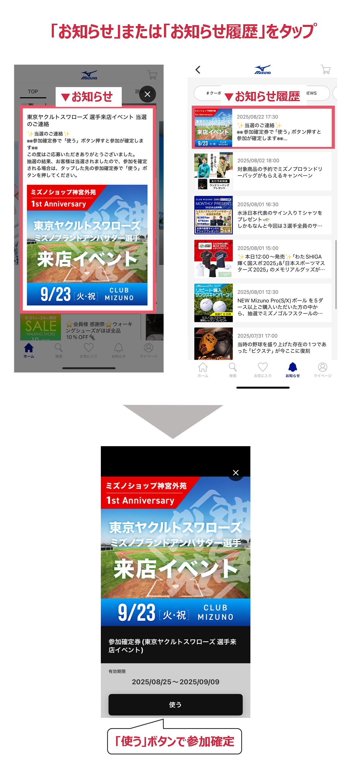 参加を確定される場合は、お知らせをタップし、表示される「参加確定券」の「使う」ボタンを押してください。