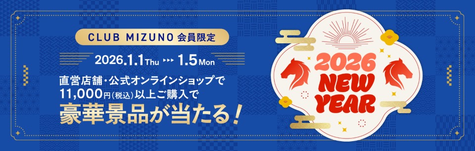 2026年1月1日(木)〜1月5日(月)の期間中、ミズノ直営店もしくはミズノ公式オンラインショップで一会計11,000円(税込)以上ご購入のCLUB MIZUNO会員の方に抽選で景品をプレゼント。