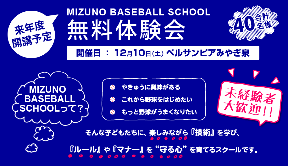 【ミズノベースボールスクール】無料体験会 宮城県 黒川郡 ベルサンピアみやぎ泉