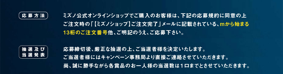 - ご応募時は、ご注文時の「【ミズノショップ】ご注文完了のご連絡」メールのmから始まる13桁のご注文番号が必要です。