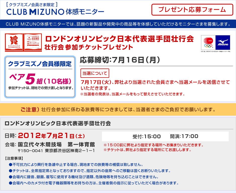 【CLUB MIZUNO 体感モニター】ロンドンオリンピック日本代表選手団壮行会:参加チケットプレゼント