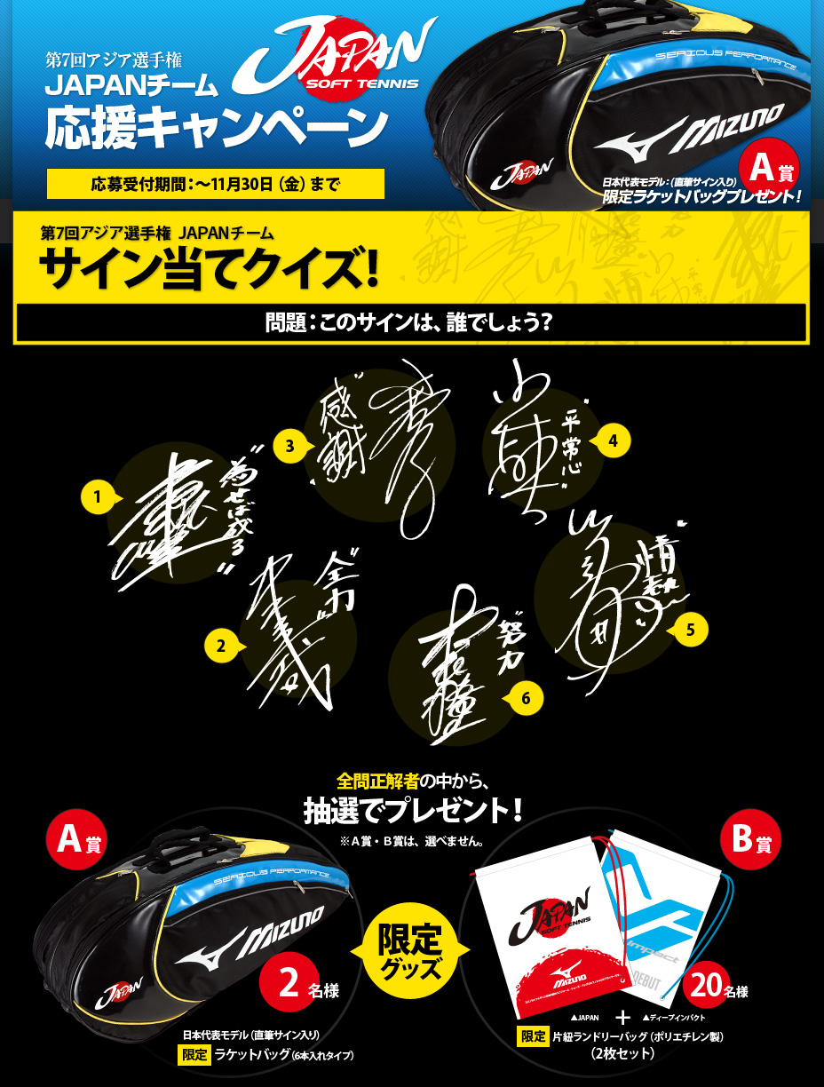 A賞「日本代表モデル(直筆サイン入り)限定ラケットバッグ(6本入れタイプ)」2名様