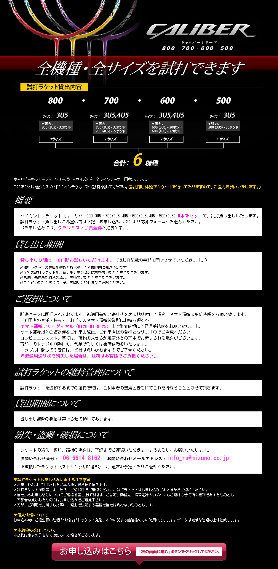 【バドミントン】キャリバーシリーズ試打ラケット貸出:応募フォーム