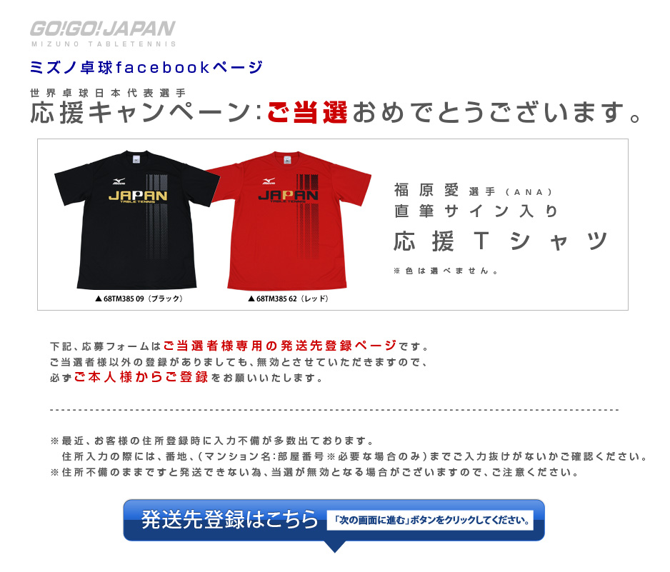 【卓球】日本代表選手応援キャンペーン(代表応援Tシャツご当選)
