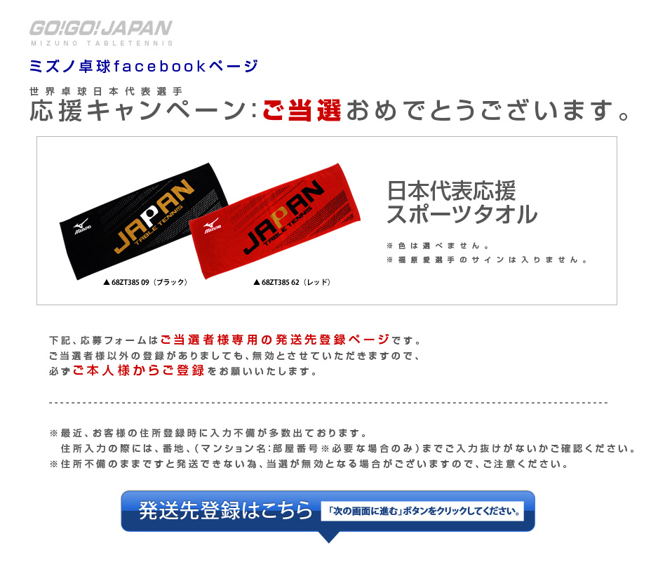 【卓球】日本代表選手応援キャンペーン(代表応援タオルご当選)