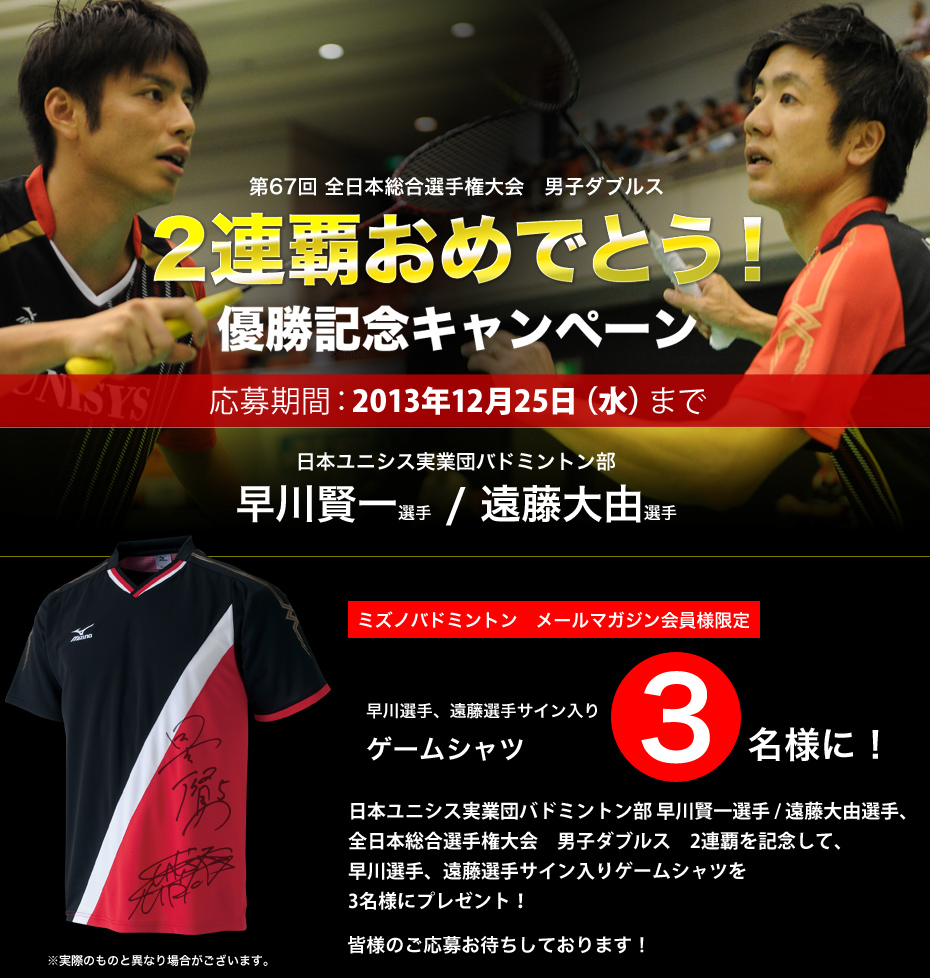 ミズノバドミントンメールマガジン購読のチェックをしていただいた方のみ抽選の対象とさせていただきます。