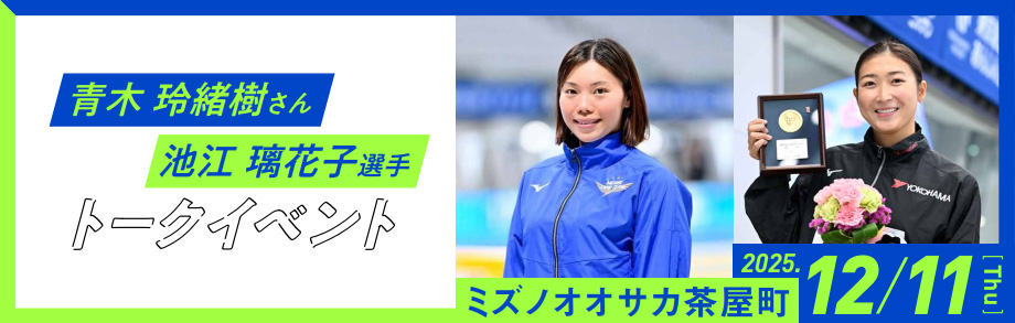 ミズノブランドアンバサダー青木玲緒樹さん、池江璃花子選手 トークライブイベント 【開催日】 2025年12月11日(木)17:00 〜 17:40まで(予定) 【場所】 ミズノオオサカ茶屋町 7F(イベントホール) 【イベント参加費】