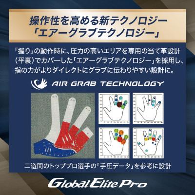 (1)操作性を高めるテクノロジーAIR GRAB TECHNOLOGY(エアーグラブテクノロジー)を搭載。二遊間のトッププロ選手の手圧データを参考に「握り」の動作時に圧力の高いエリアを専用の当革設計(平裏)でカバーし、指の力がよりダイレクトにグラブに伝わりやすい設計。