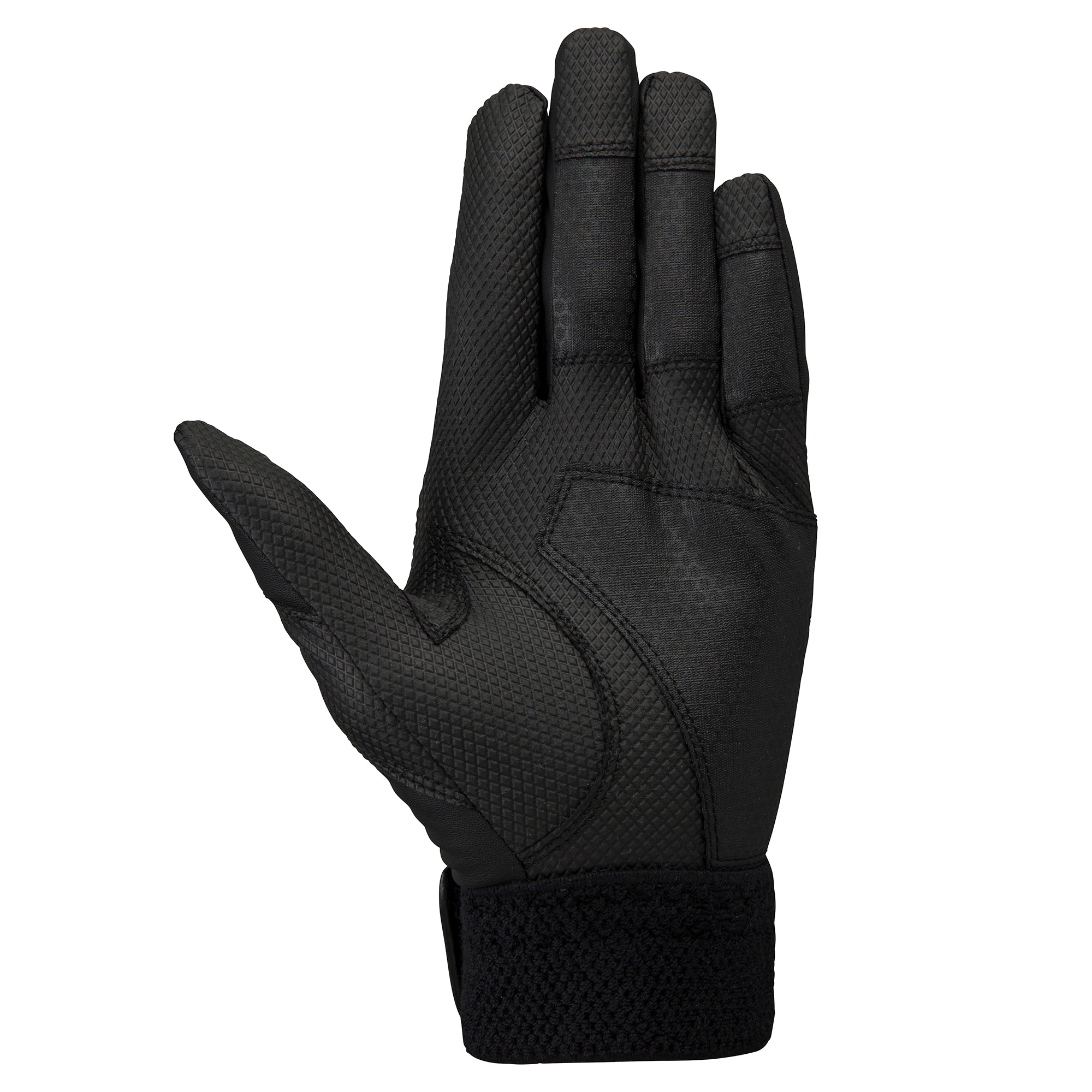スイング時の力の流れ・強さを分析し、バットへ力を伝えるのに重要な“小指・薬指・中指”と“当て革部”に、表裏両面に高いグリップ力を誇る『特殊合成皮革』を採用。指部には、手袋の内側から当て縫製することで、グリップとの接地面のみならず、手袋内部へも高いグリップ力/密着性を与えます。