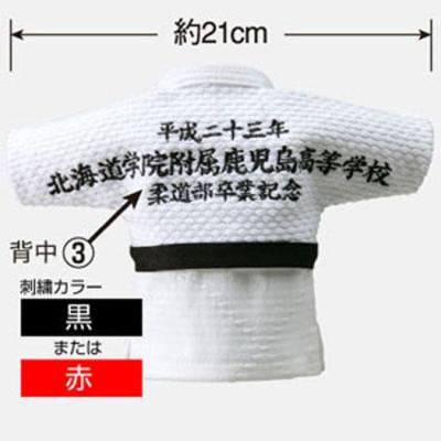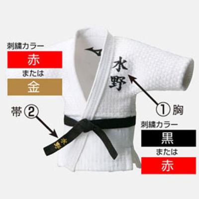 左胸、帯に個人名、各3文字まで、背中に最大27文字数を刺繍加工賜ります。