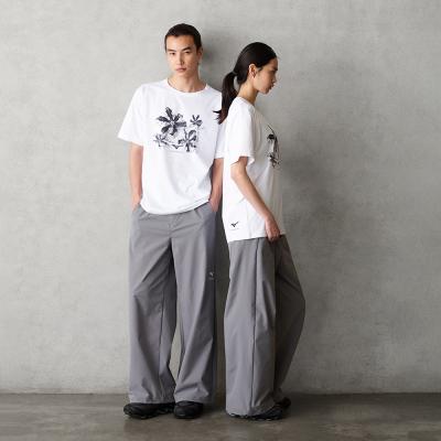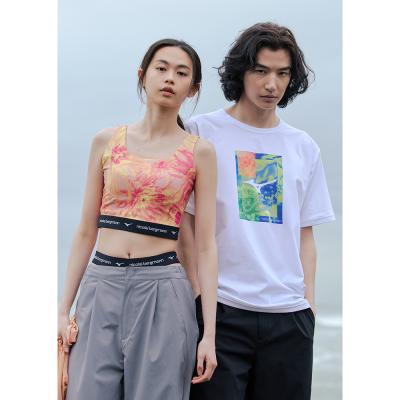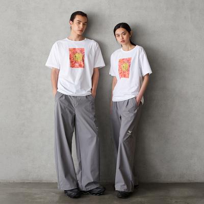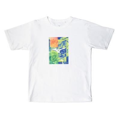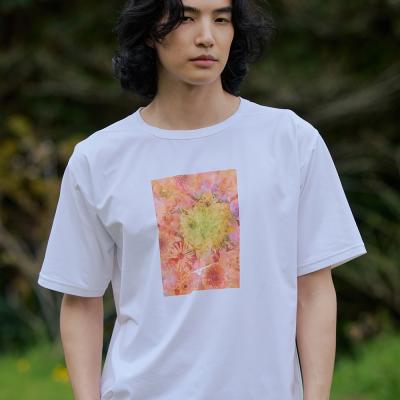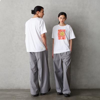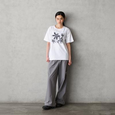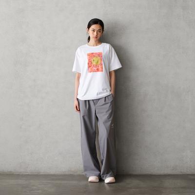 ■77カラー:身体を動かすことと有機的な曲線を描く花々の形をリンクさせたフラワーデザインをフロントにプリントした、華やかなTシャツ。
