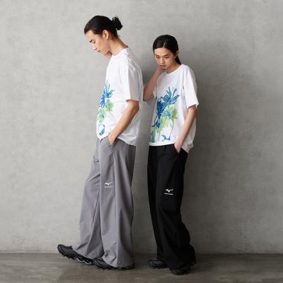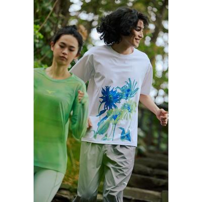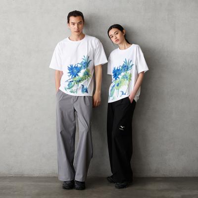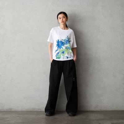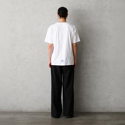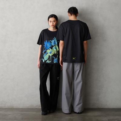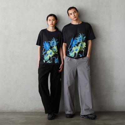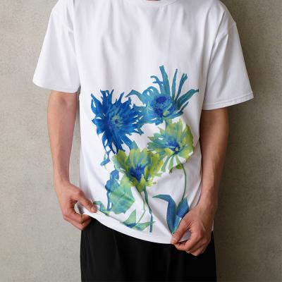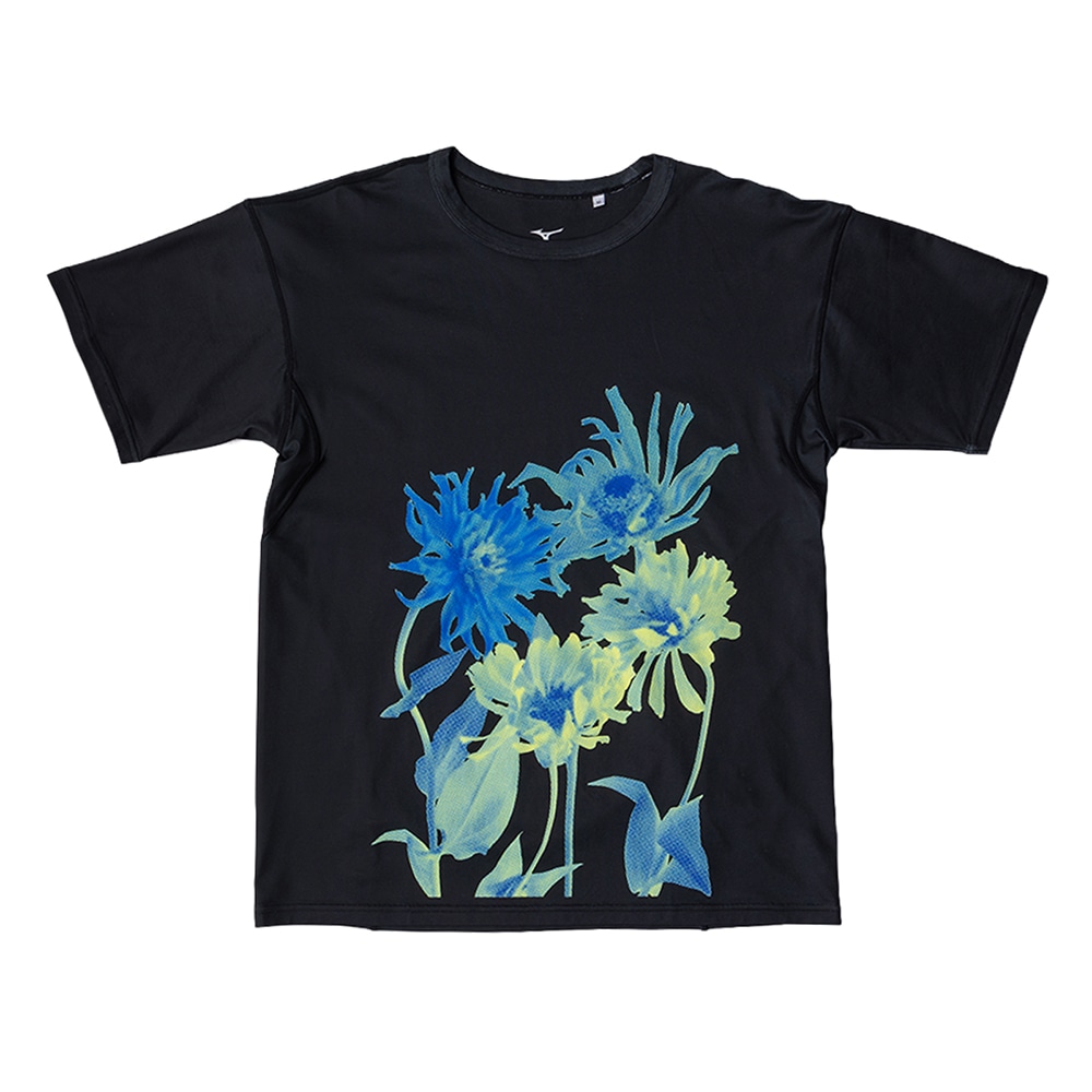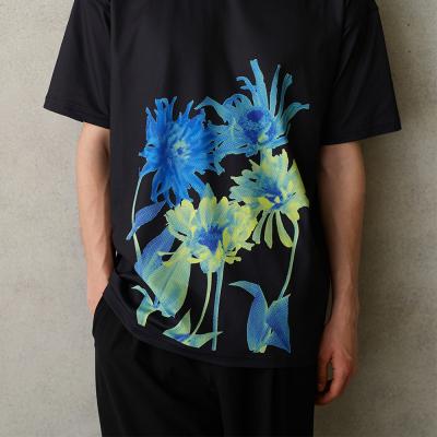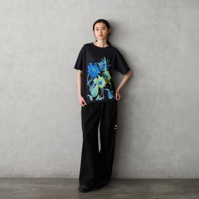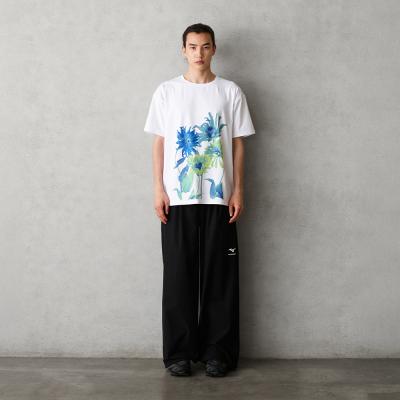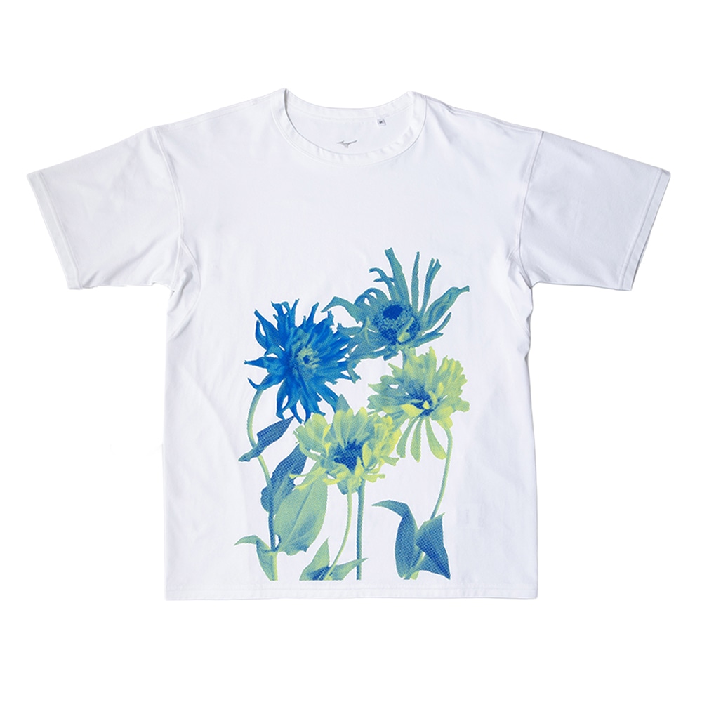 ■生き生きとしたジニアの花々を大胆にあしらい、ブルーとイエローの色調のグラフィカルなフラワーデザインがインパクトのある印象的なTシャツ。