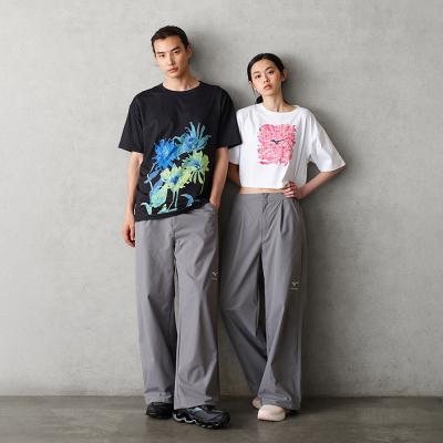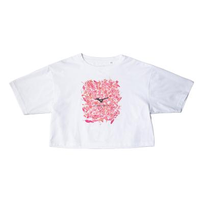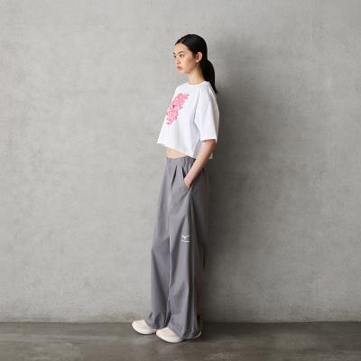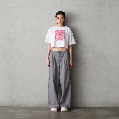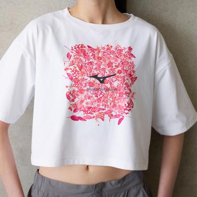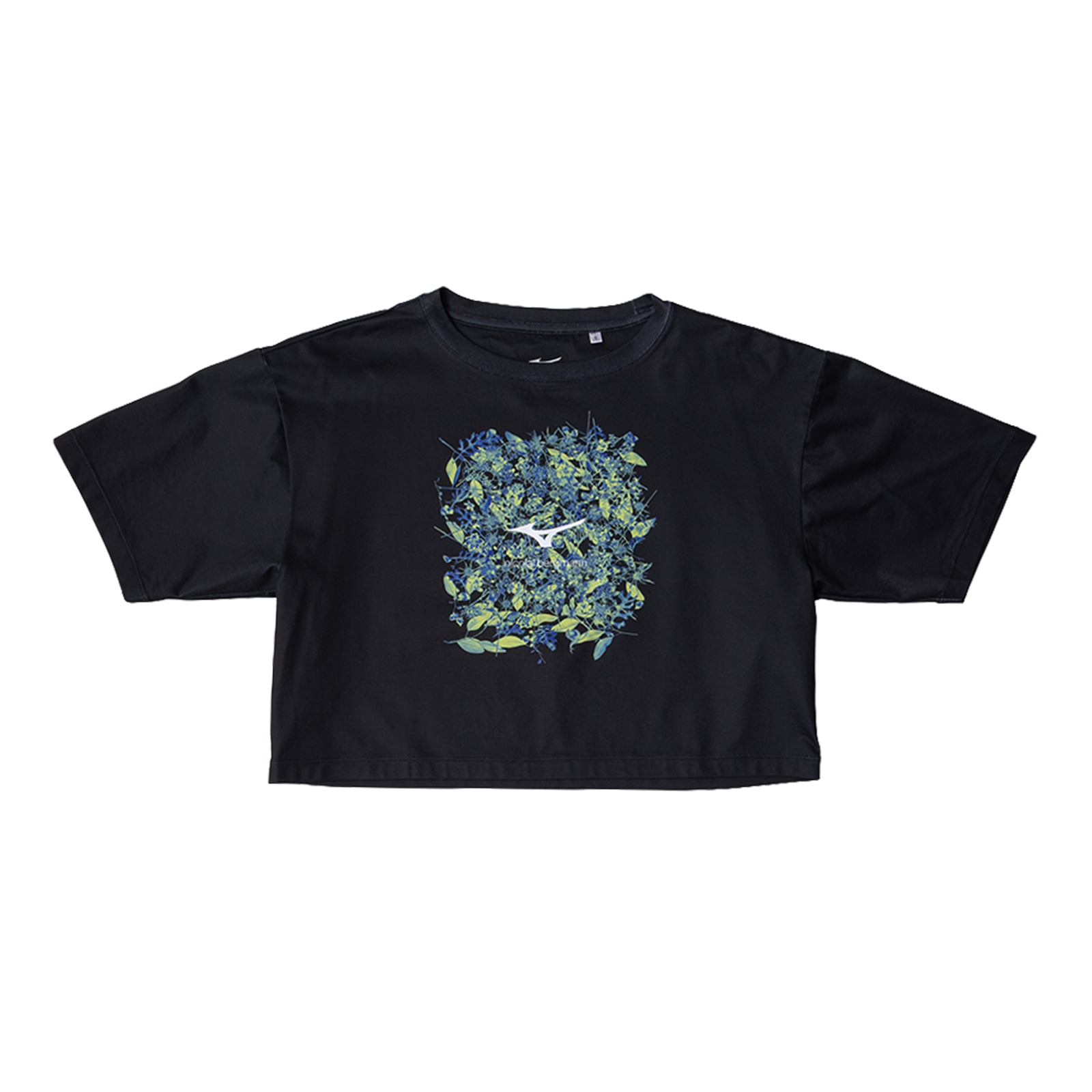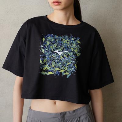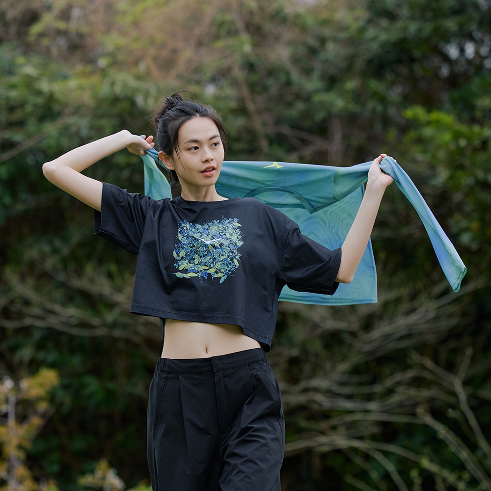 ■エリンジウム、ニゲラ、ダスティーミラー、ティナス、クレマチスなど、凛としたエッジの効いた花材のシルエットを活かしたフラワーデザインをフロントにプリントし、ワイドシルエットをルーズに着こなすこともできるクロップドTシャツ。
