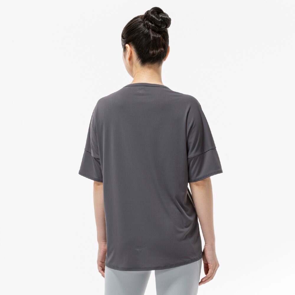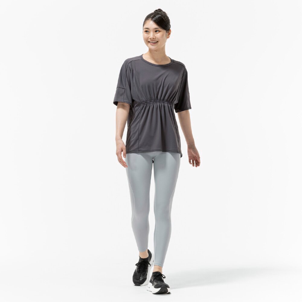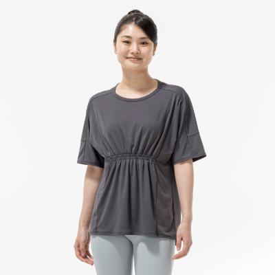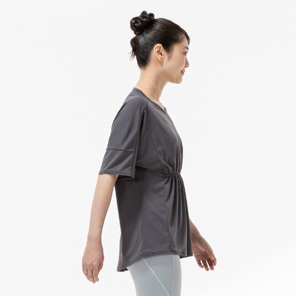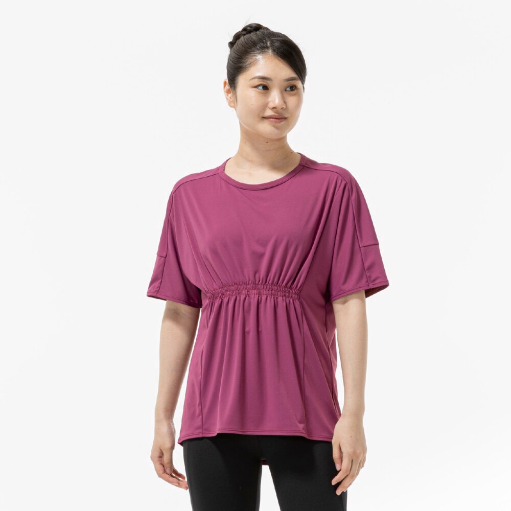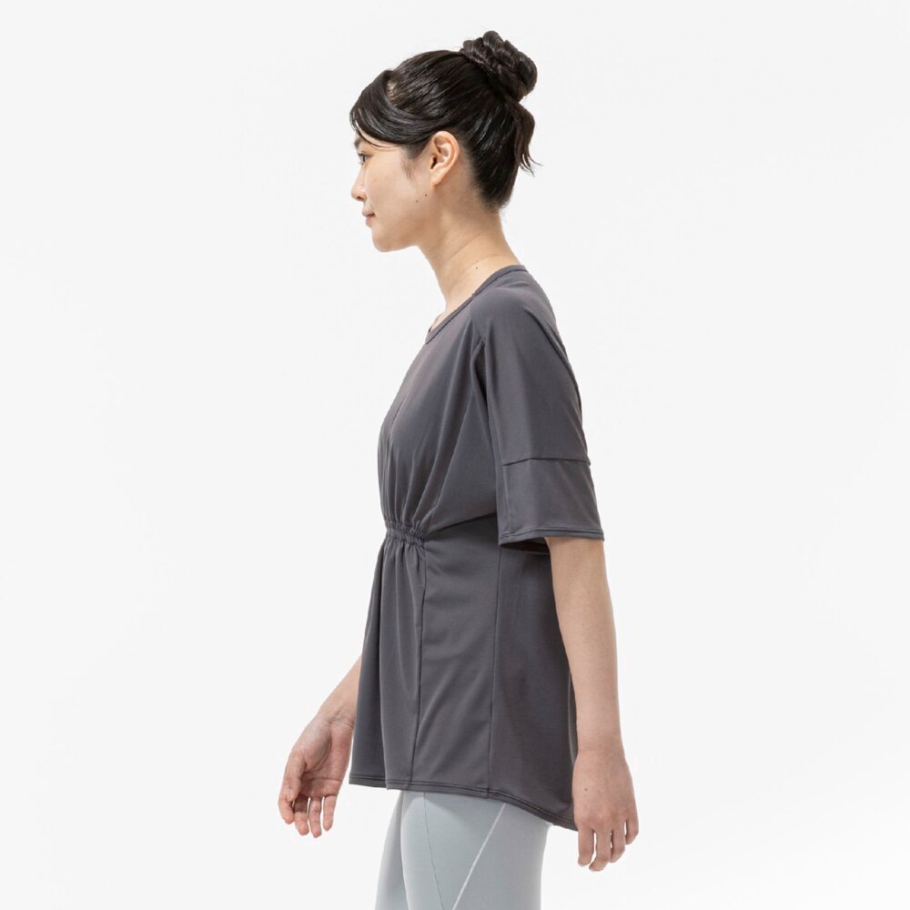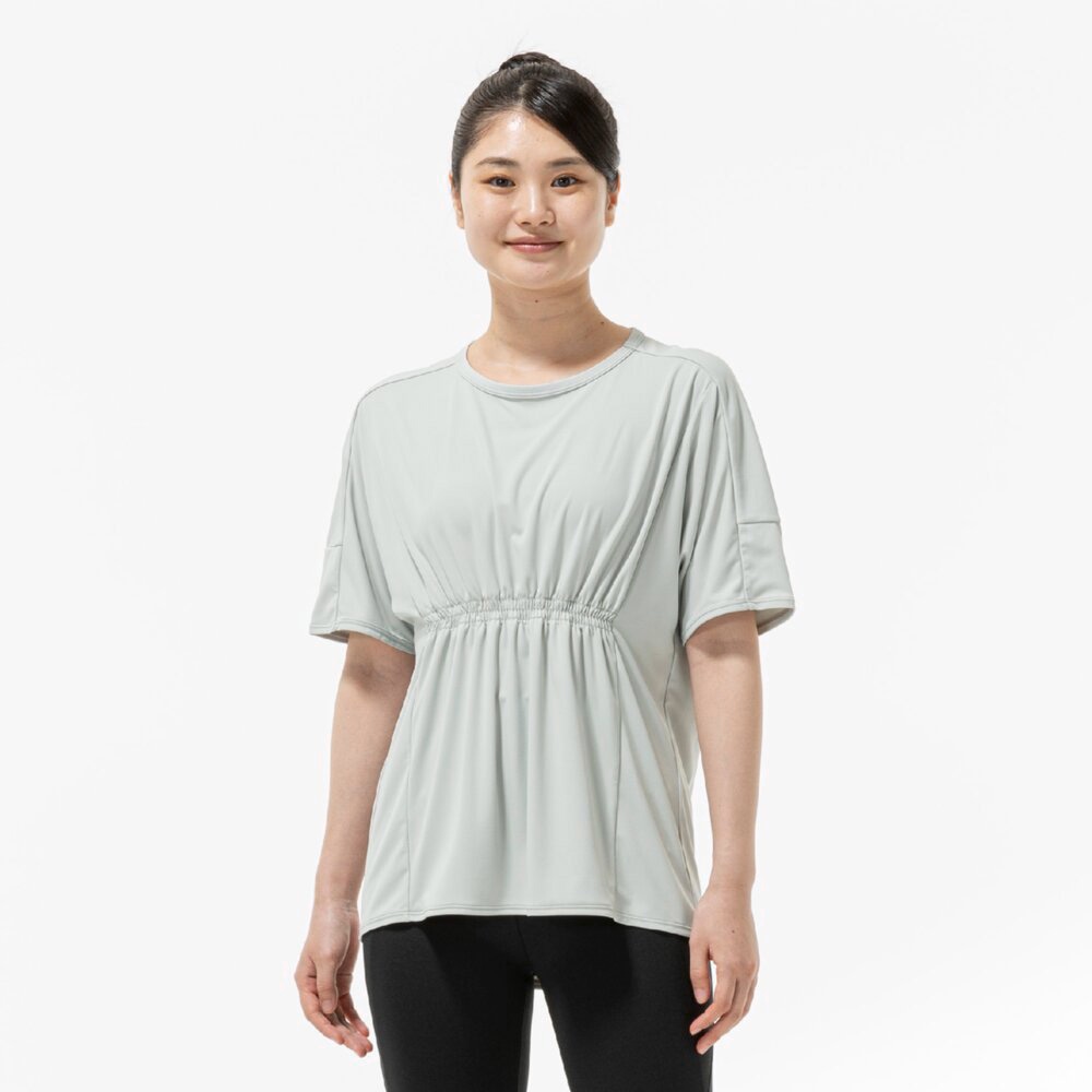 ■ギャザーデザインでお腹周りが目立ちにくく、楽なシルエットでありながら女性らしさのあるTシャツ。