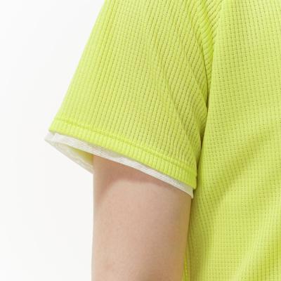 ■袖口と裾にシアー素材を重ね、スポーティなTシャツにさり気なく女性らしさをプラスした1着。