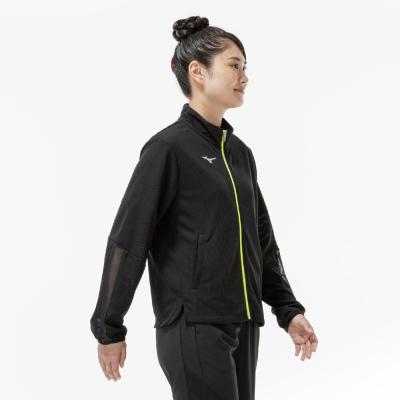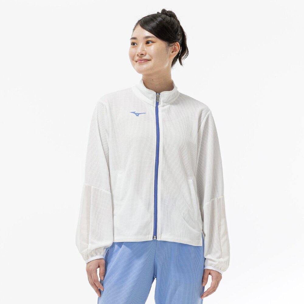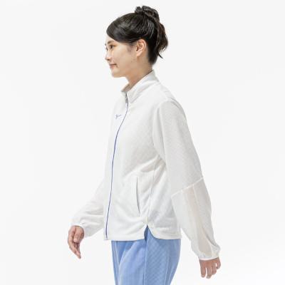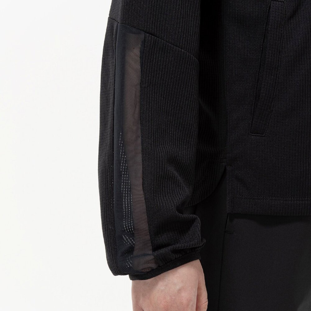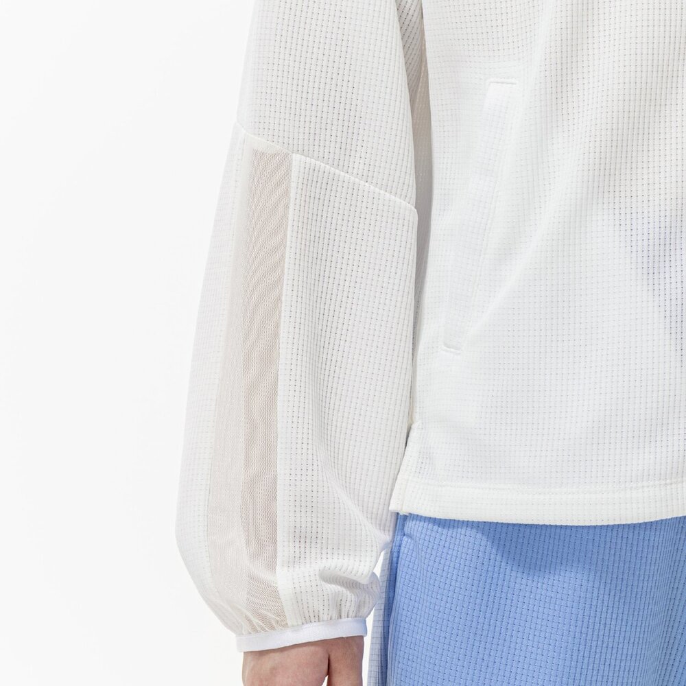 ■衿元、袖と後身頃に部分的にシアー素材を使用しスポーティなジャケットに女性らしさをプラスした1着。