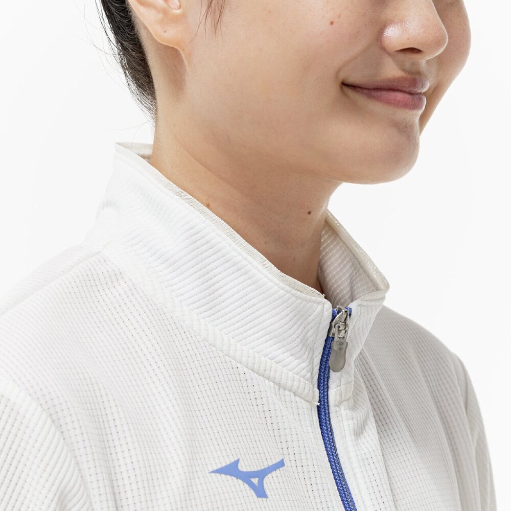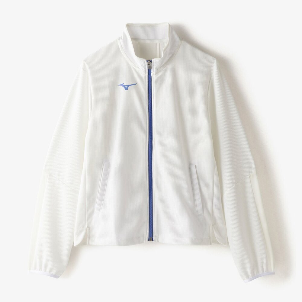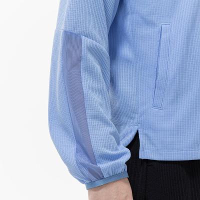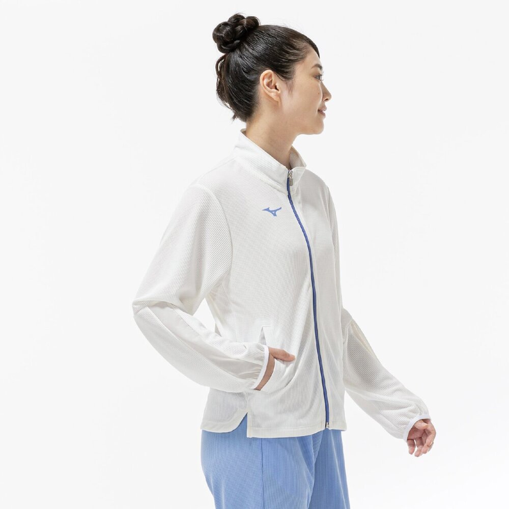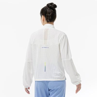 ■衿元、袖と後身頃に部分的にシアー素材を使用しスポーティなジャケットに女性らしさをプラスした1着。