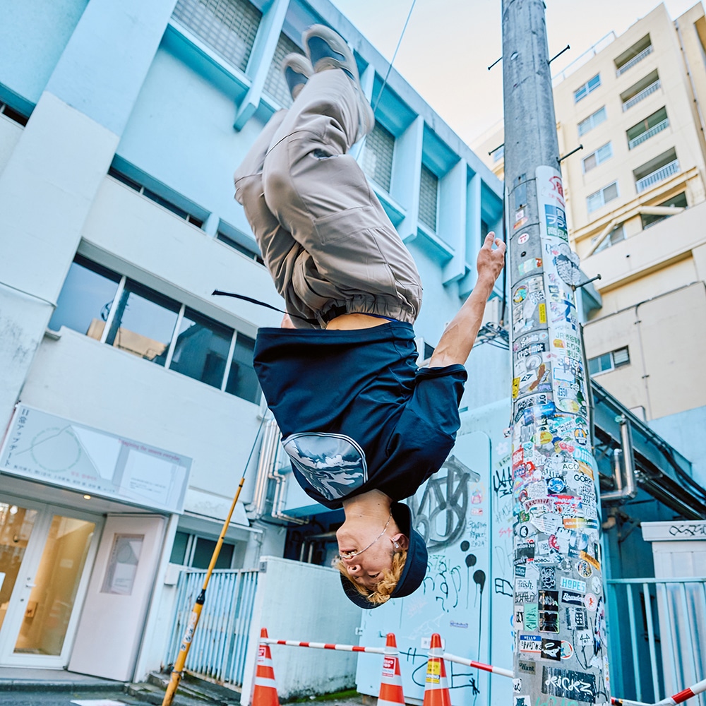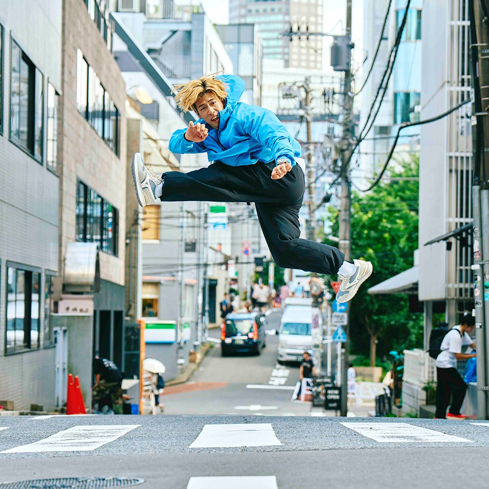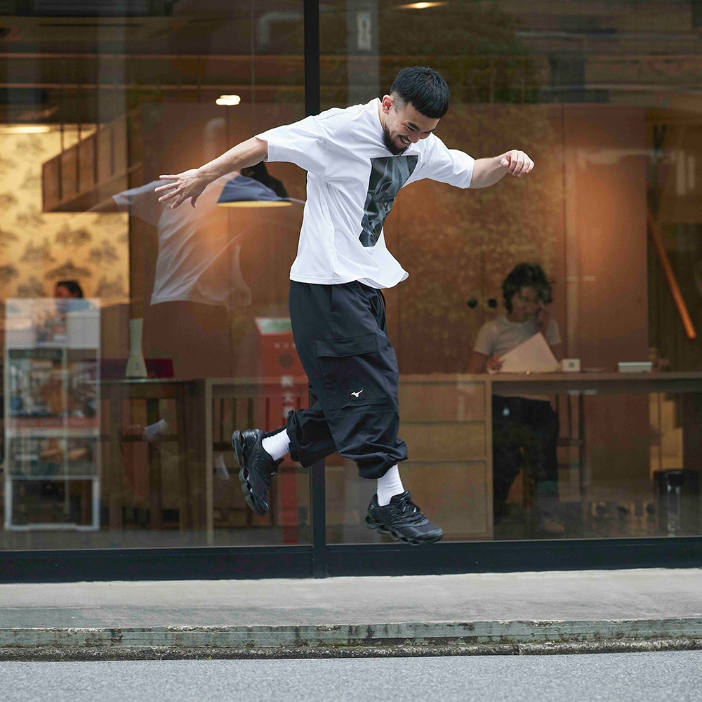 無機質な線が幾重にも重なり、畝りとなって縦横無尽に駆け巡り、洗練された都市を舞台に、アーバンスポーツの本質と、ミズノブランドの象徴であるランバードマークを融合し、アウトマークとして表現。
