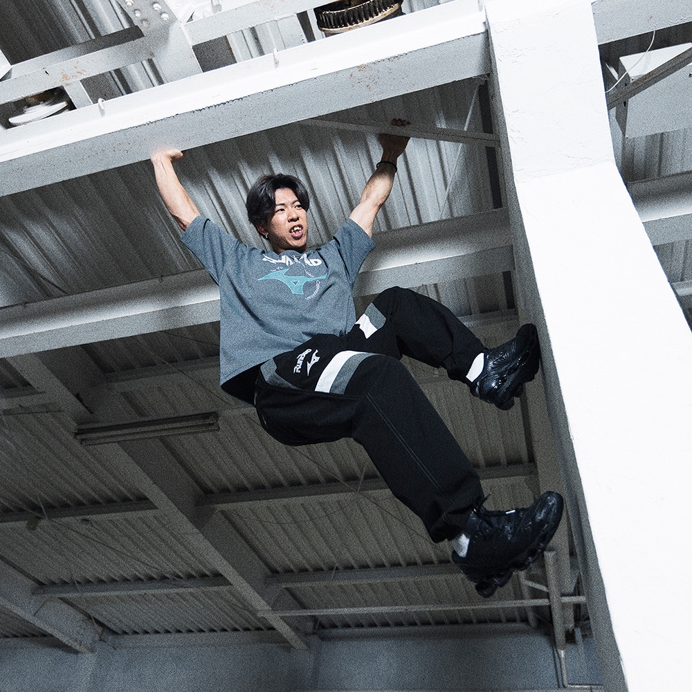 ■アーバンスポーツの本質〈自由と自己表現〉とミズノブランドの象徴であるRUNBIRDマークを融合し、アウトマークとして表現。