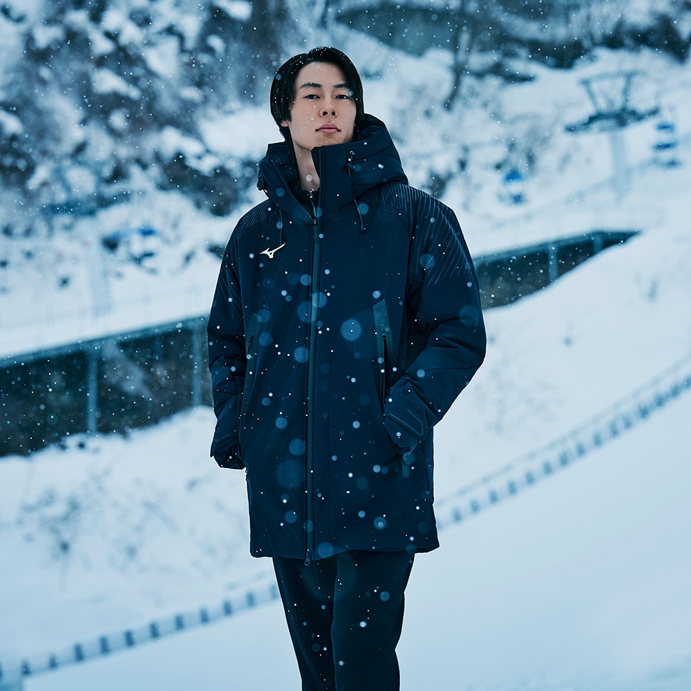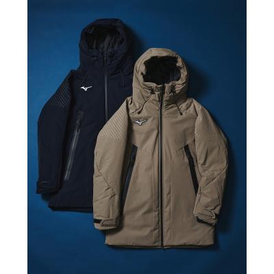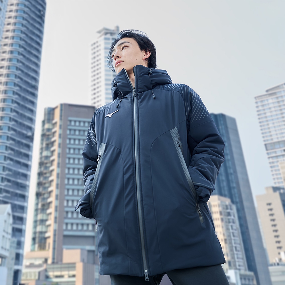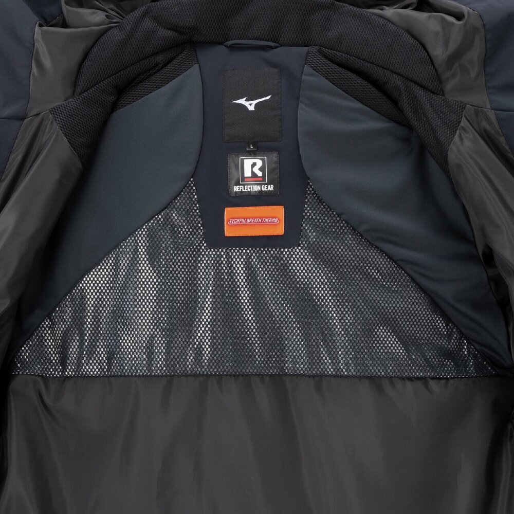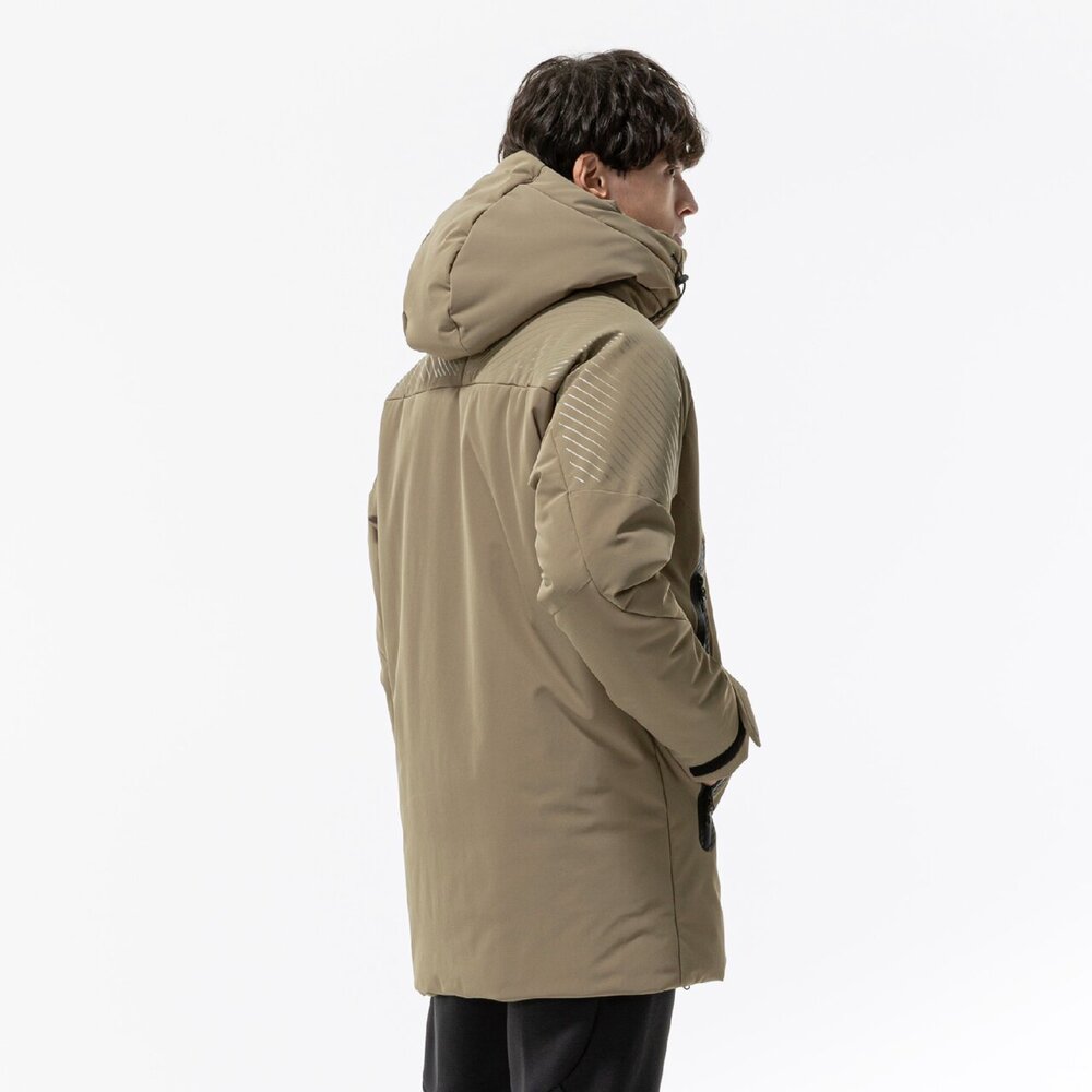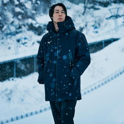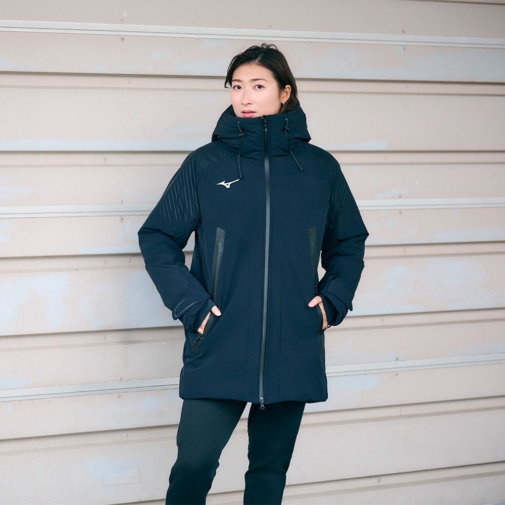 | 素材 | 表地、本体・フード:ナイロン85%、ポリウレタン15% 内衿・フード裏:ポリエステル100% 裏地:ポリエステル100% 中綿、本体:ポリエステル83%、合成繊維(ブレスサーモ)17% フード、内衿:ポリエステル100% インナーカフス部:ポリエステル92%、ポリウレタン8% |