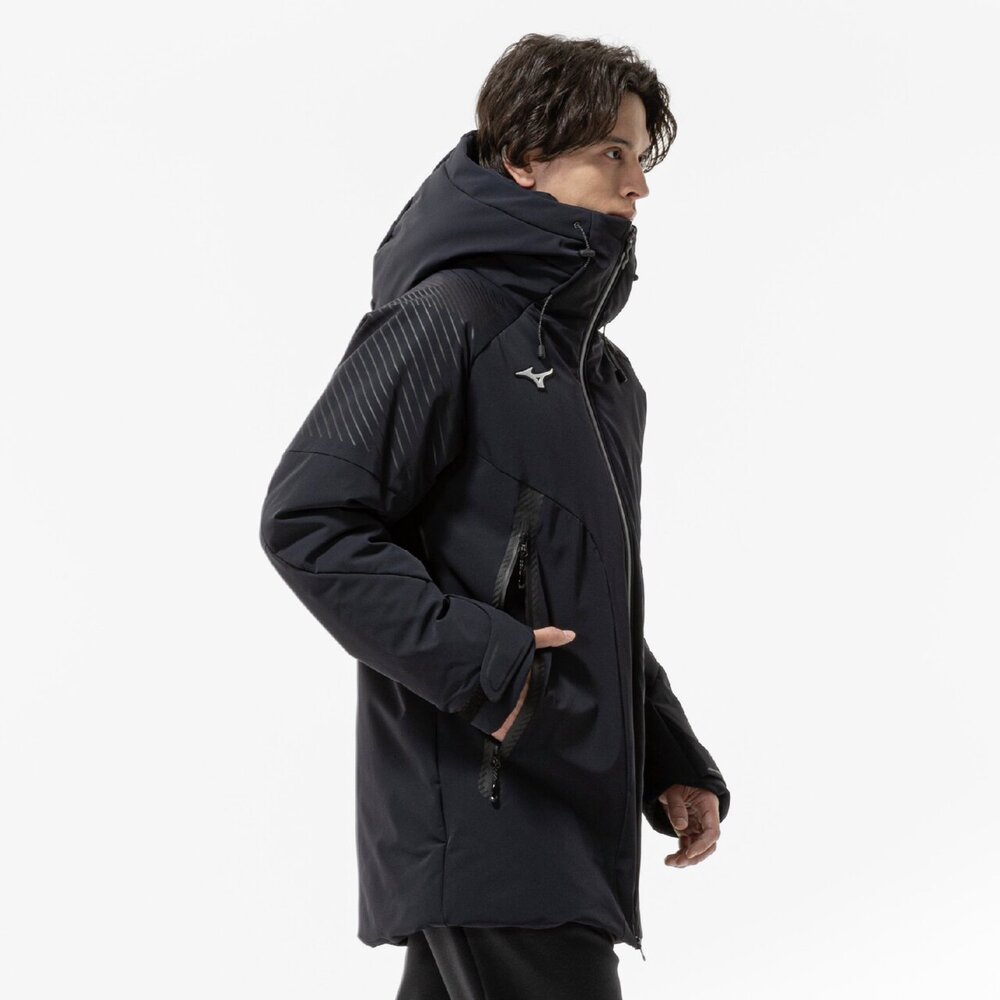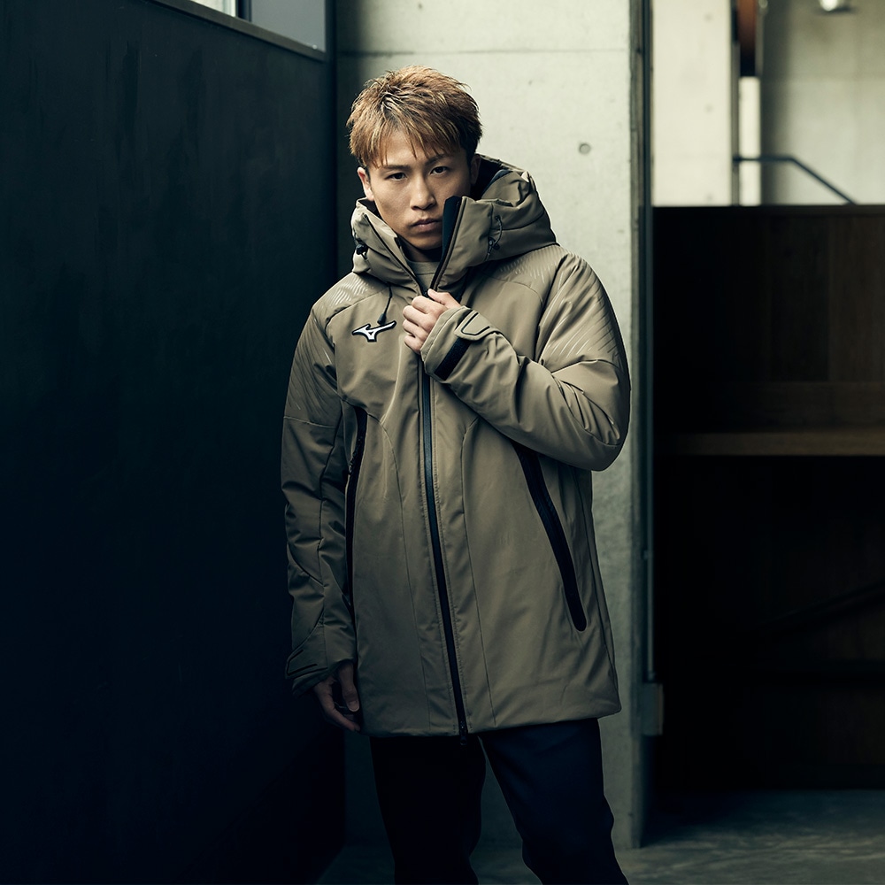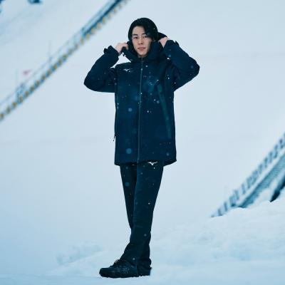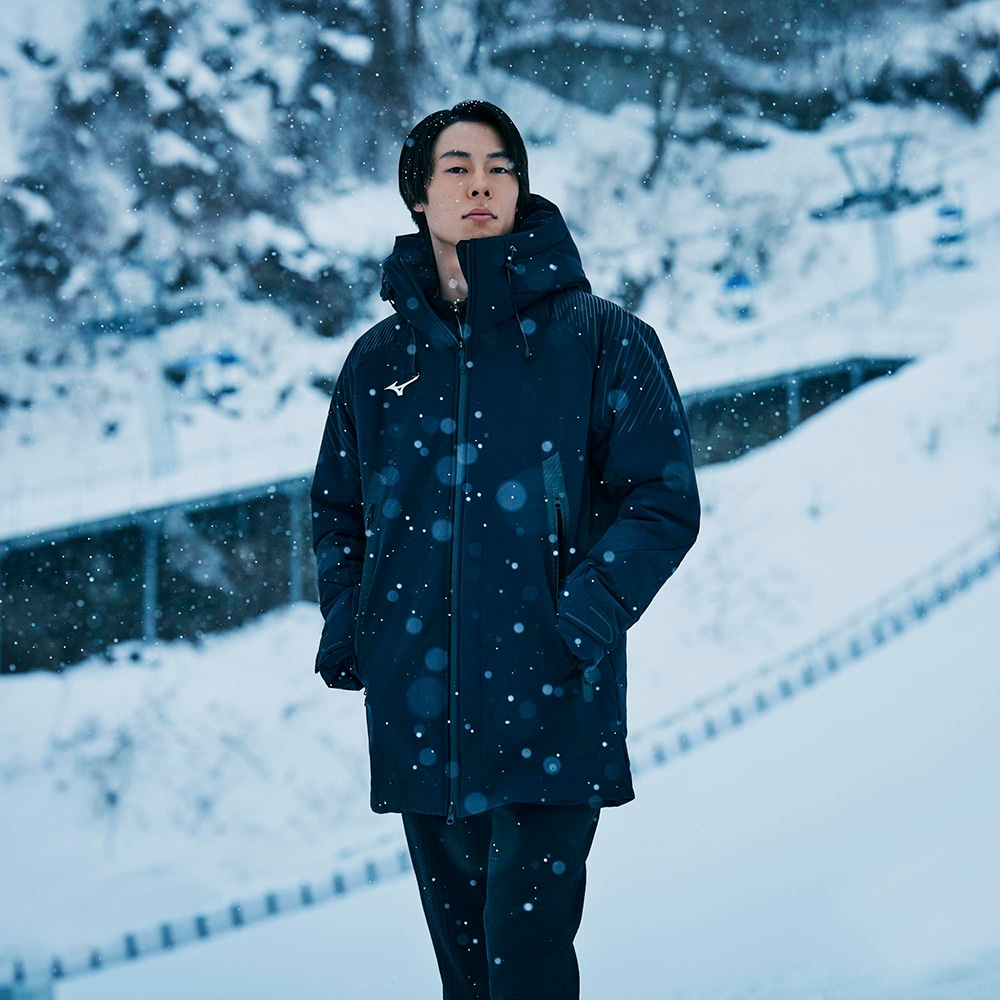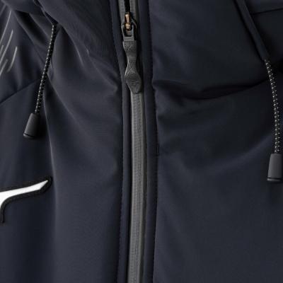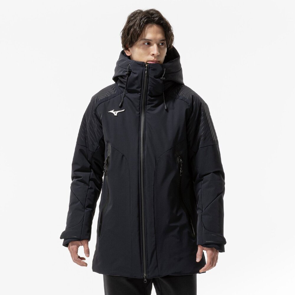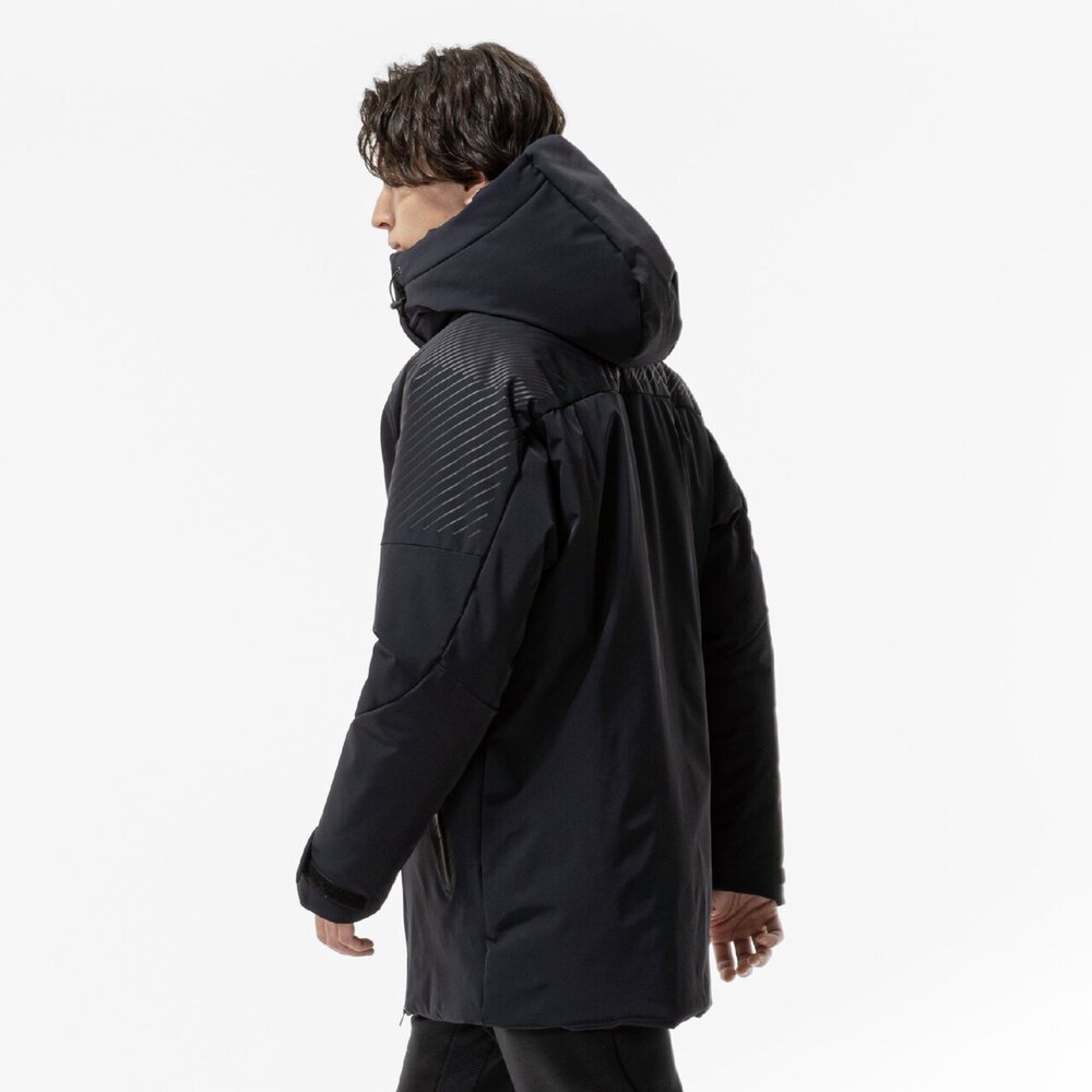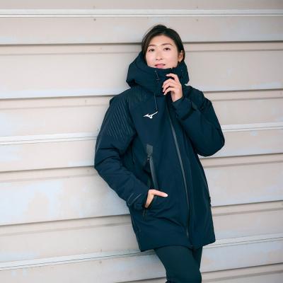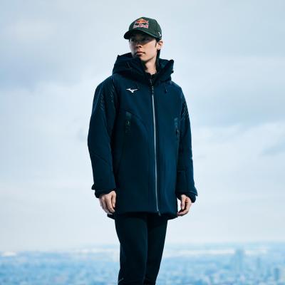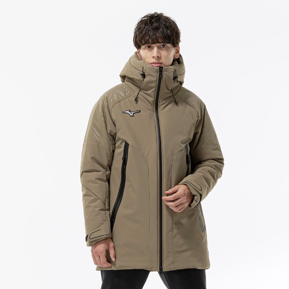 | 素材 | 表地、本体・フード:ナイロン85%、ポリウレタン15% 内衿・フード裏:ポリエステル100% 裏地:ポリエステル100% 中綿、本体:ポリエステル83%、合成繊維(ブレスサーモ)17% フード、内衿:ポリエステル100% インナーカフス部:ポリエステル92%、ポリウレタン8% |