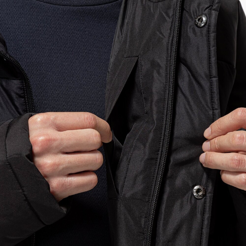 | 素材 | 表地:ポリエステル100% 裏地:ポリエステル100% 中綿、本体:ポリエステル83%、合成繊維(ブレスサーモ)17% 脇・袖下・前立・衿・フード:ポリエステル100% インナーカフス部:ナイロン82%、ポリウレタン18% |