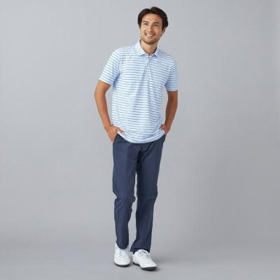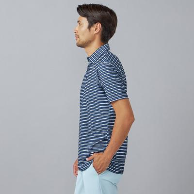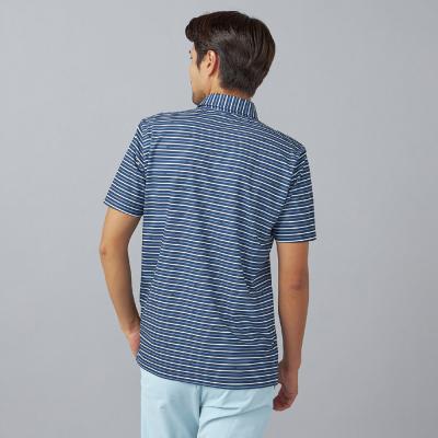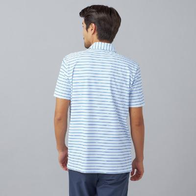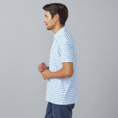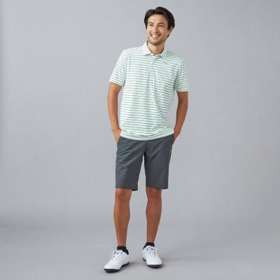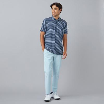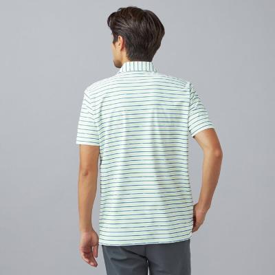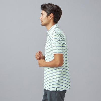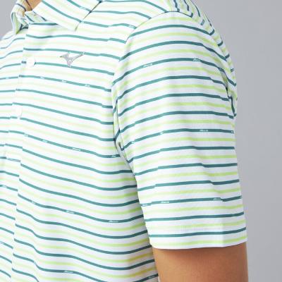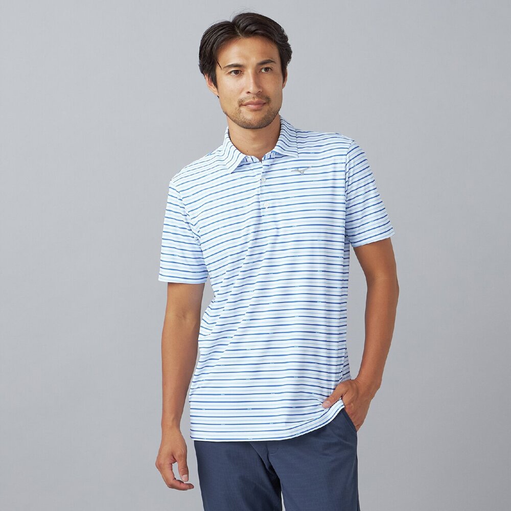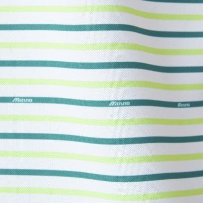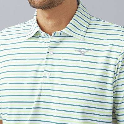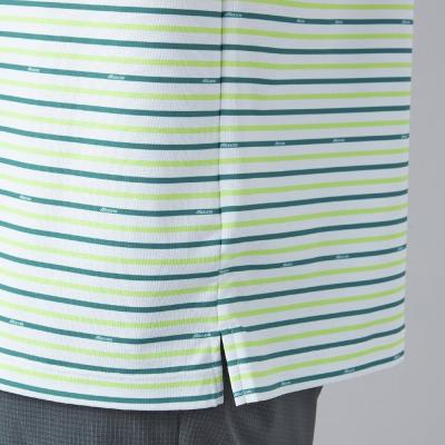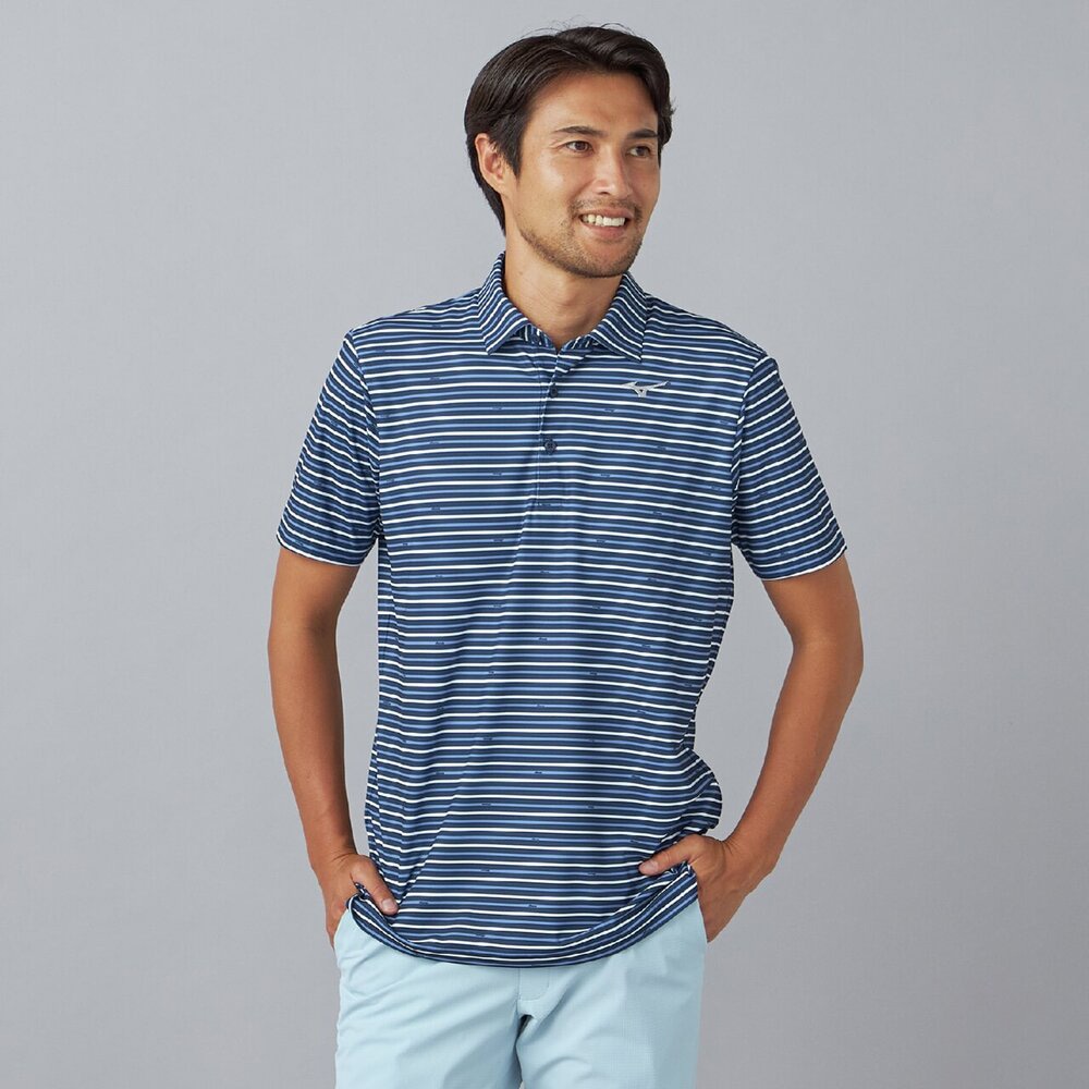 ベーシックなマルチボーダープリントにmizunoロゴを散りばめたデザイン。夏のゴルフでも映える爽やかなカラーリングのプリントデザイン。
