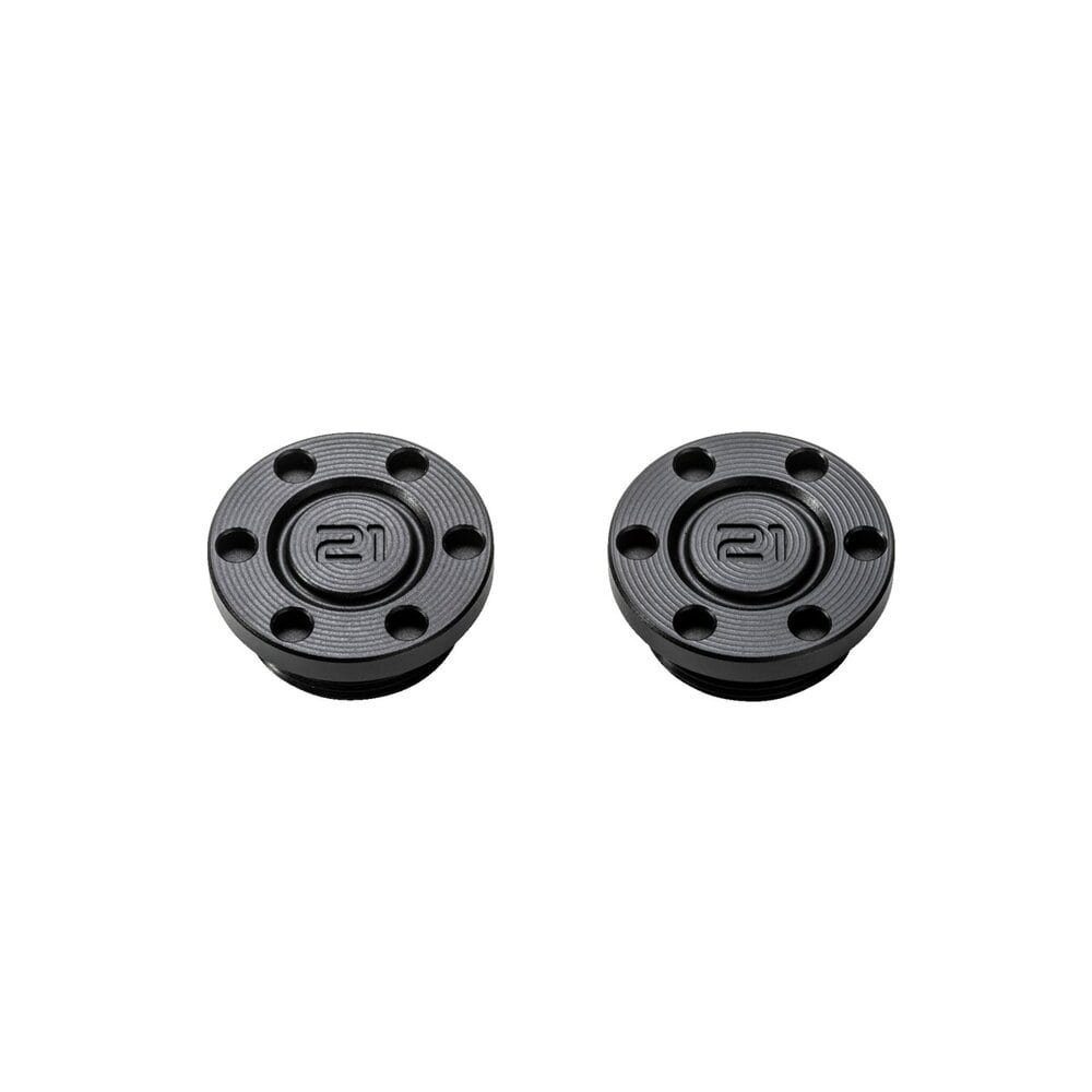 ②片方のウエイトを垂直にしてネジ穴とかみ合うようにセットし、手で軽く回してください。もう一方のウエイトも同様にセットし、両方のウエイトを手で均等に交互に回しながらバックパーツを軽く固定してください。