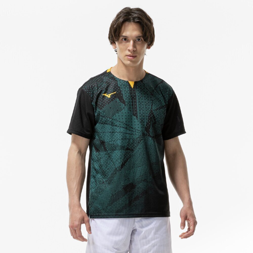 ■トレンド感のあるグラフィックでデザインに奥行きをプラス。襟周りのアクセントカラーで華やかな印象に。