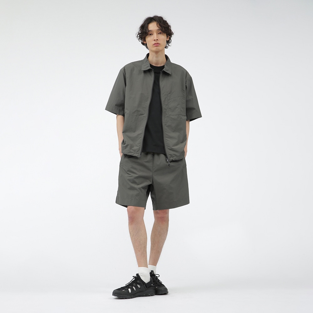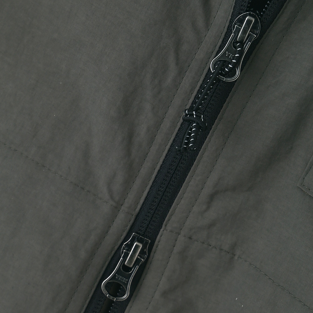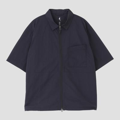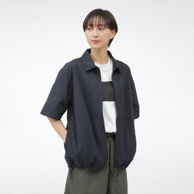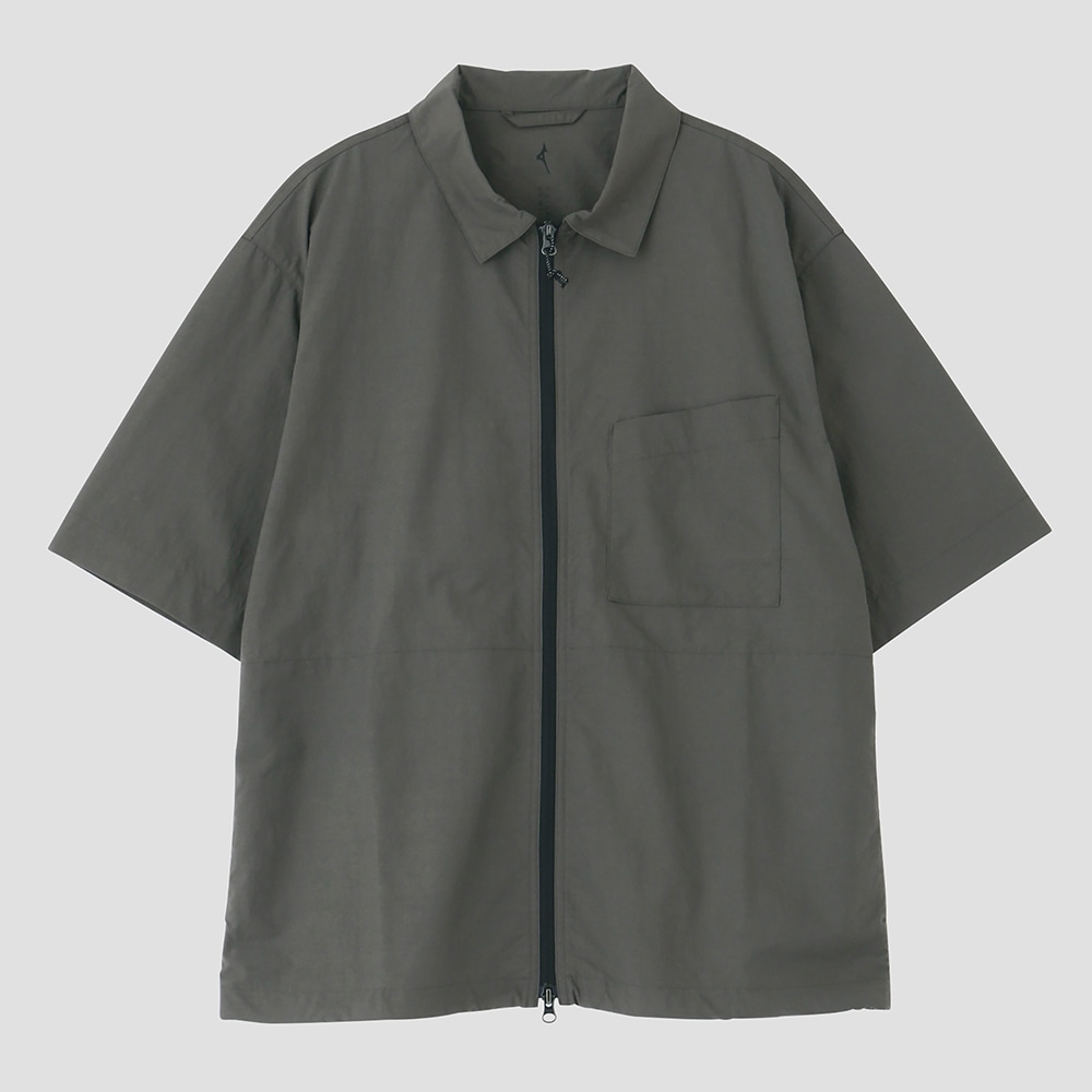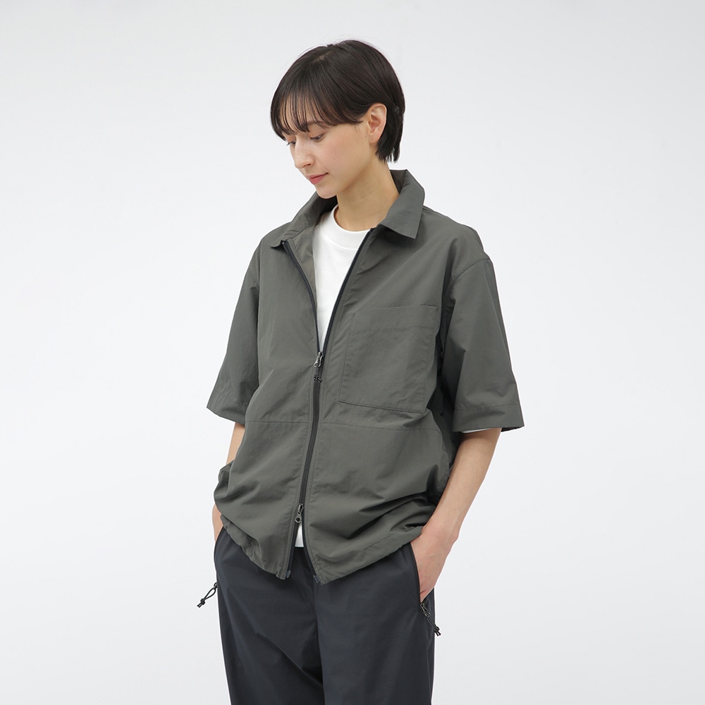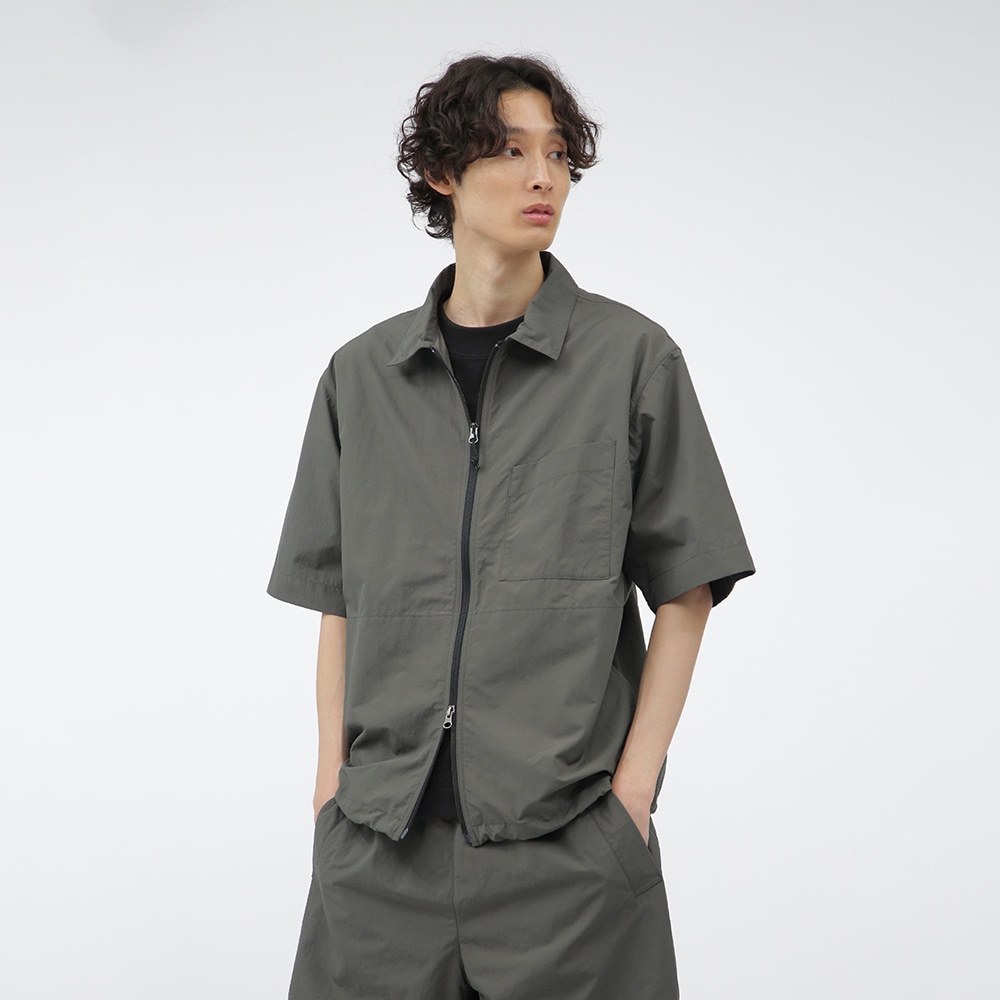 ■フロントには逆開仕様のファスナーを使用し、下側のスファスナーを開けたり、裾のスピンドルを絞って動きをもたせたスタイリングが可能なシャツ。