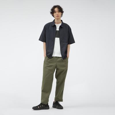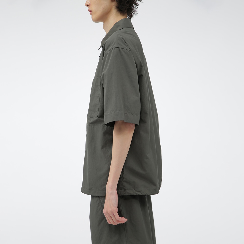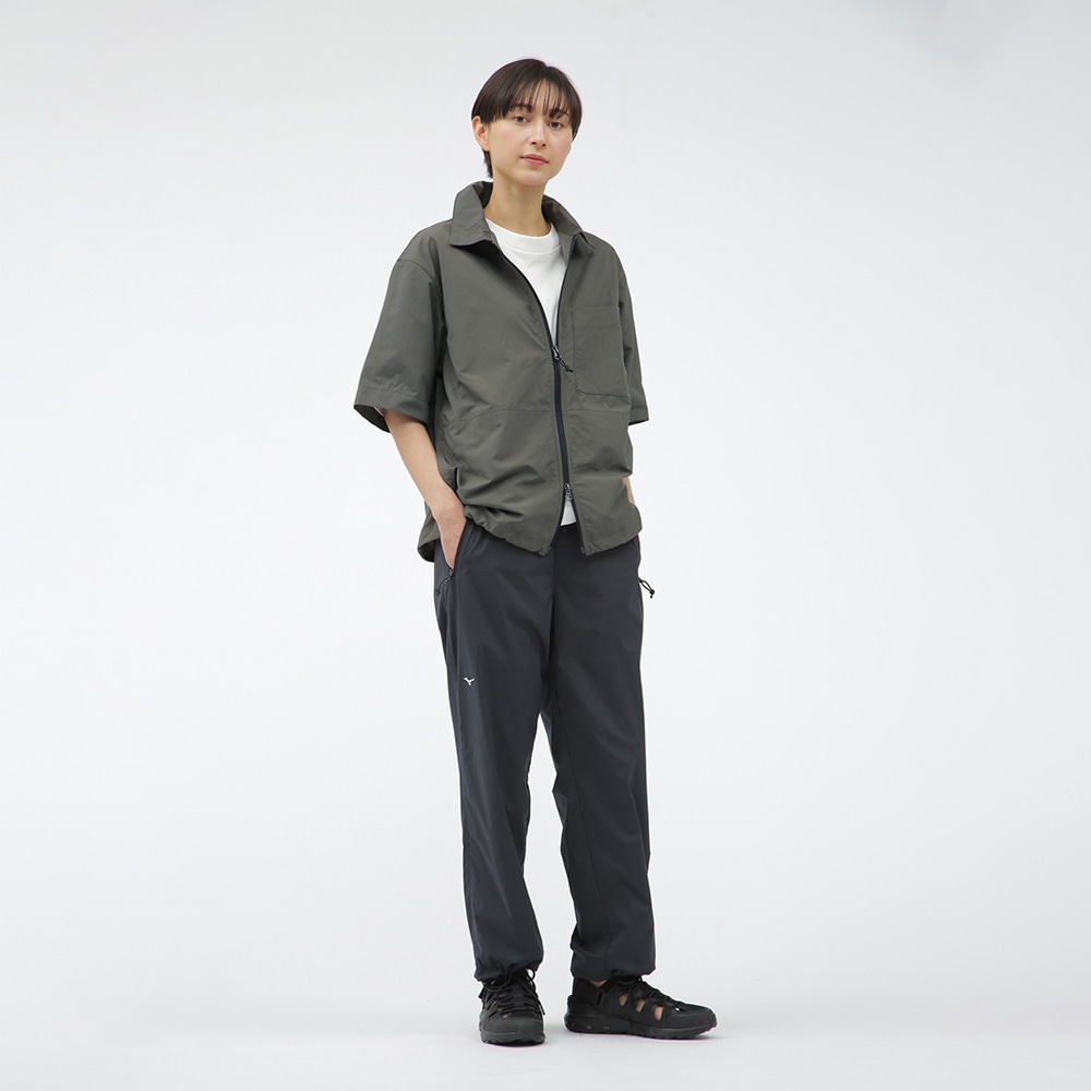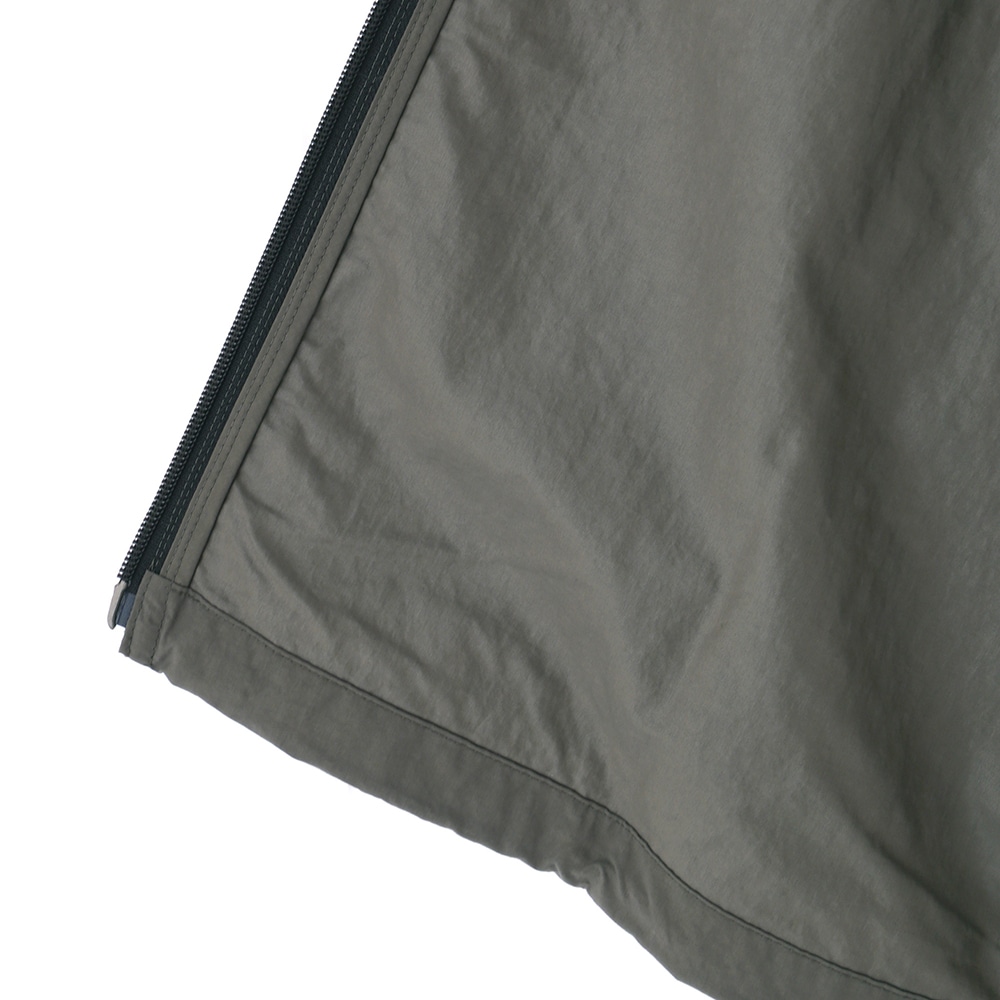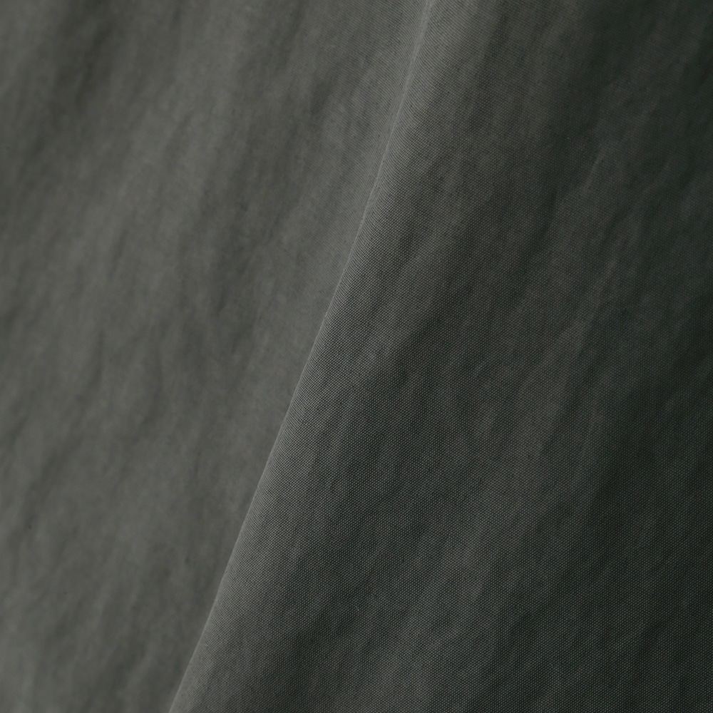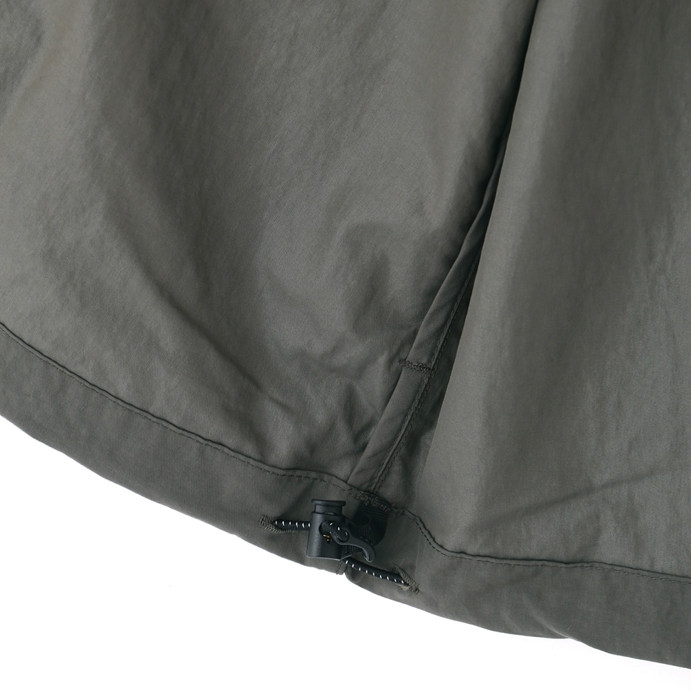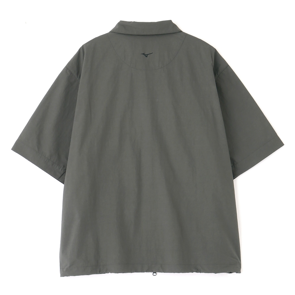 ■フロントには逆開仕様のファスナーを使用し、下側のスファスナーを開けたり、裾のスピンドルを絞って動きをもたせたスタイリングが可能なシャツ。