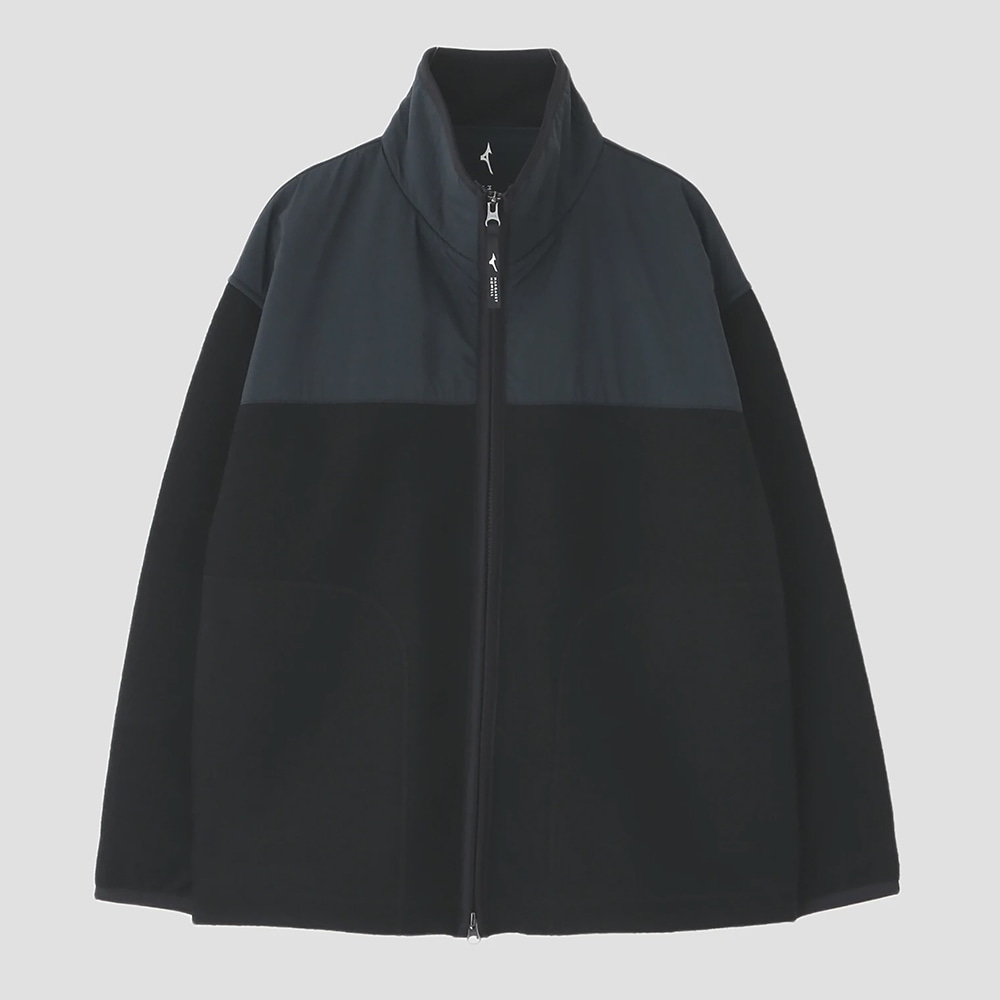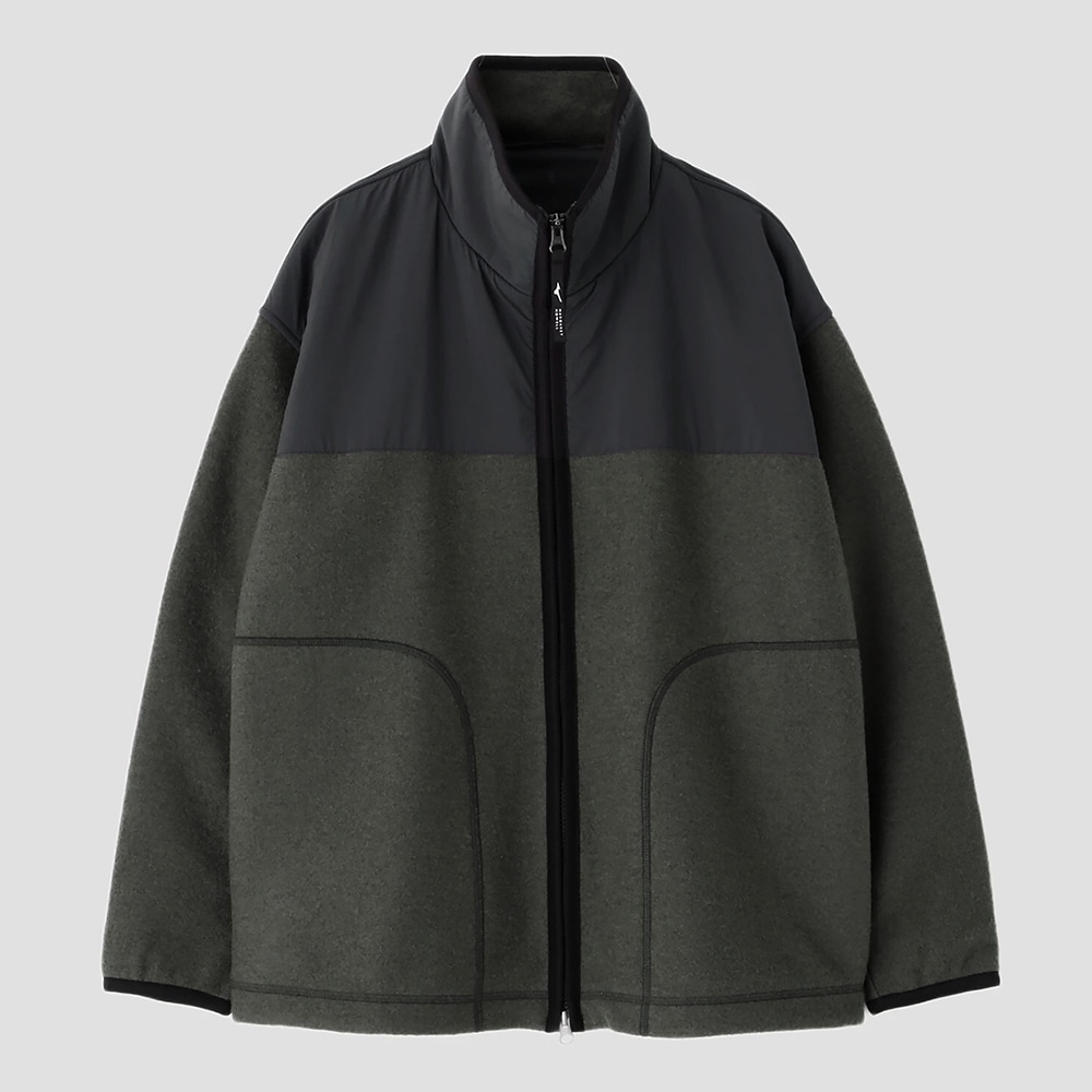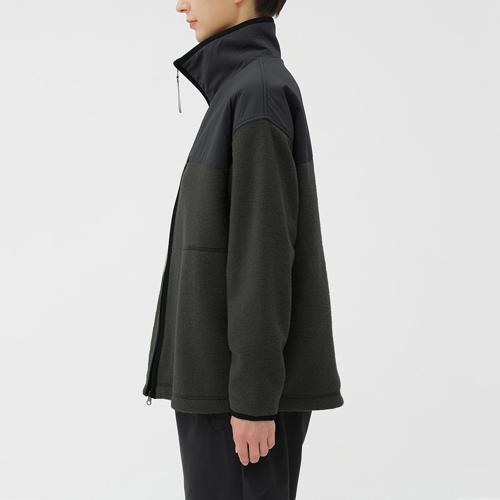肩まわりをカバーすることで雨濡れを軽減でき、機能性と素材の切り替えを際立たせたテックジャケット。