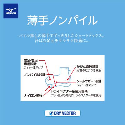 - 「ドライベクター」には、糸自体に抗菌防臭効果があり、繊維上の細菌の増殖や汗臭の発生を抑制します。このソックスにはドライベクター糸と抗菌糸を使用しています。