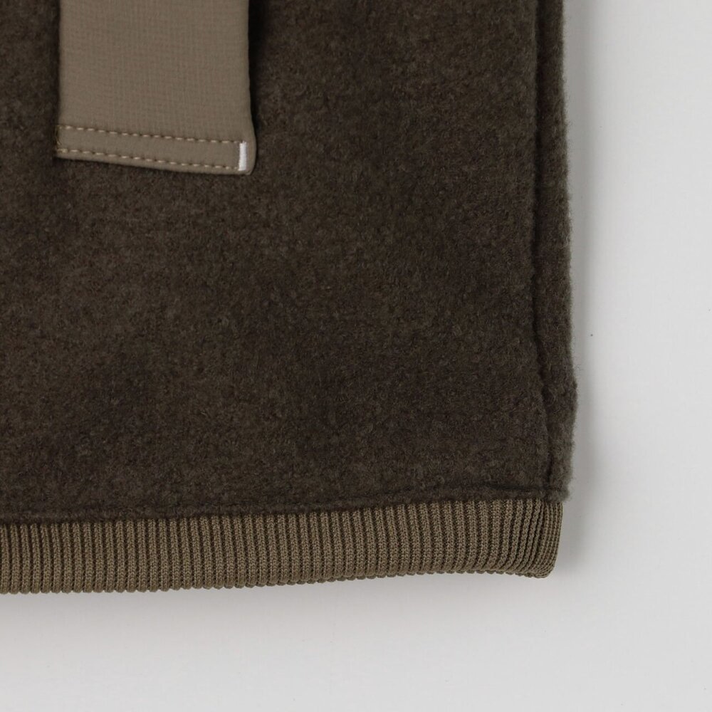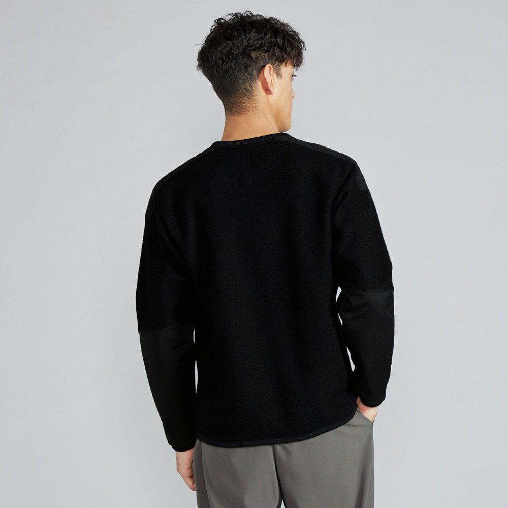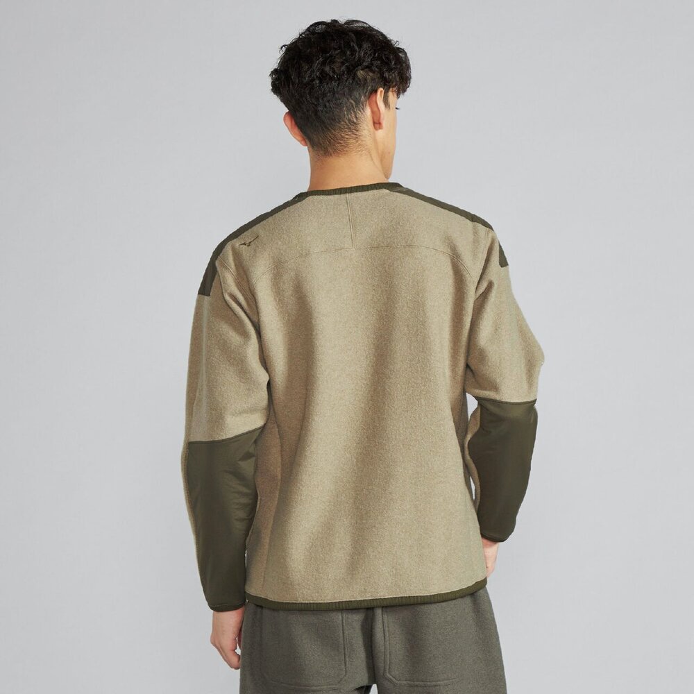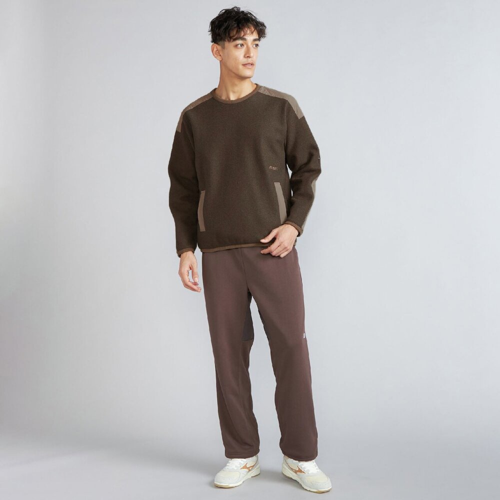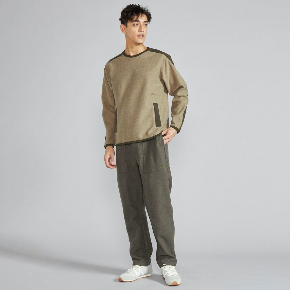 擦れて毛玉になりやすい腰ポケットや肩には布帛を使用した少しレトロ感のあるアウトドアカジュアルテイストのデザインで、セーター代わりに着用できるアイテムです。