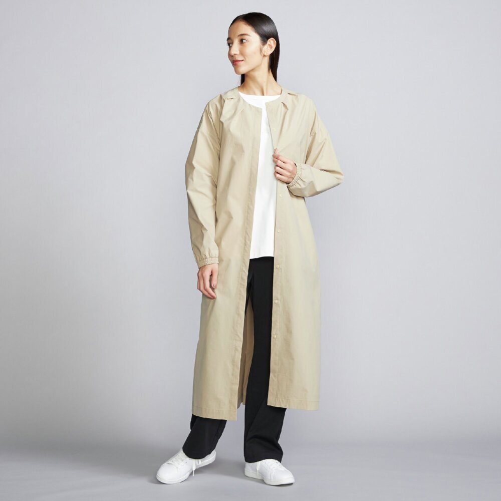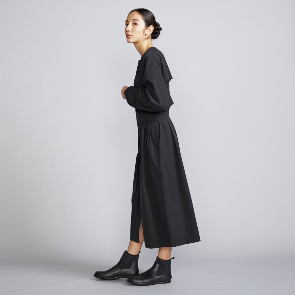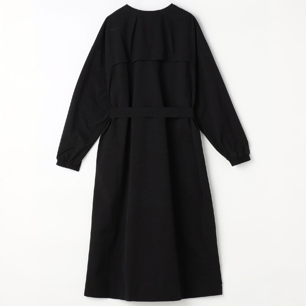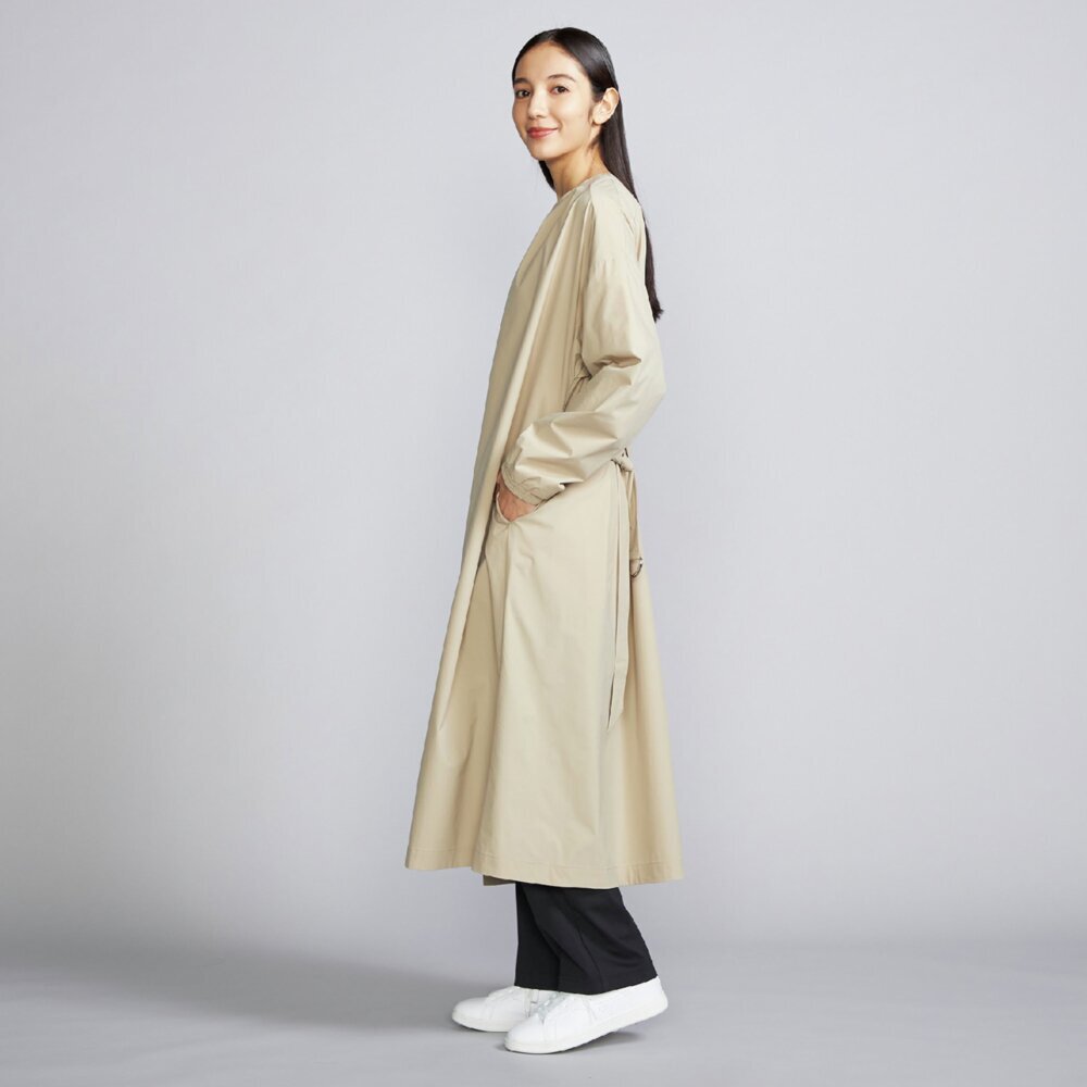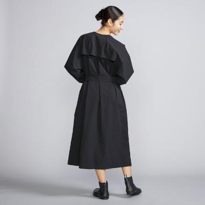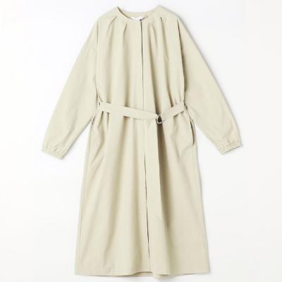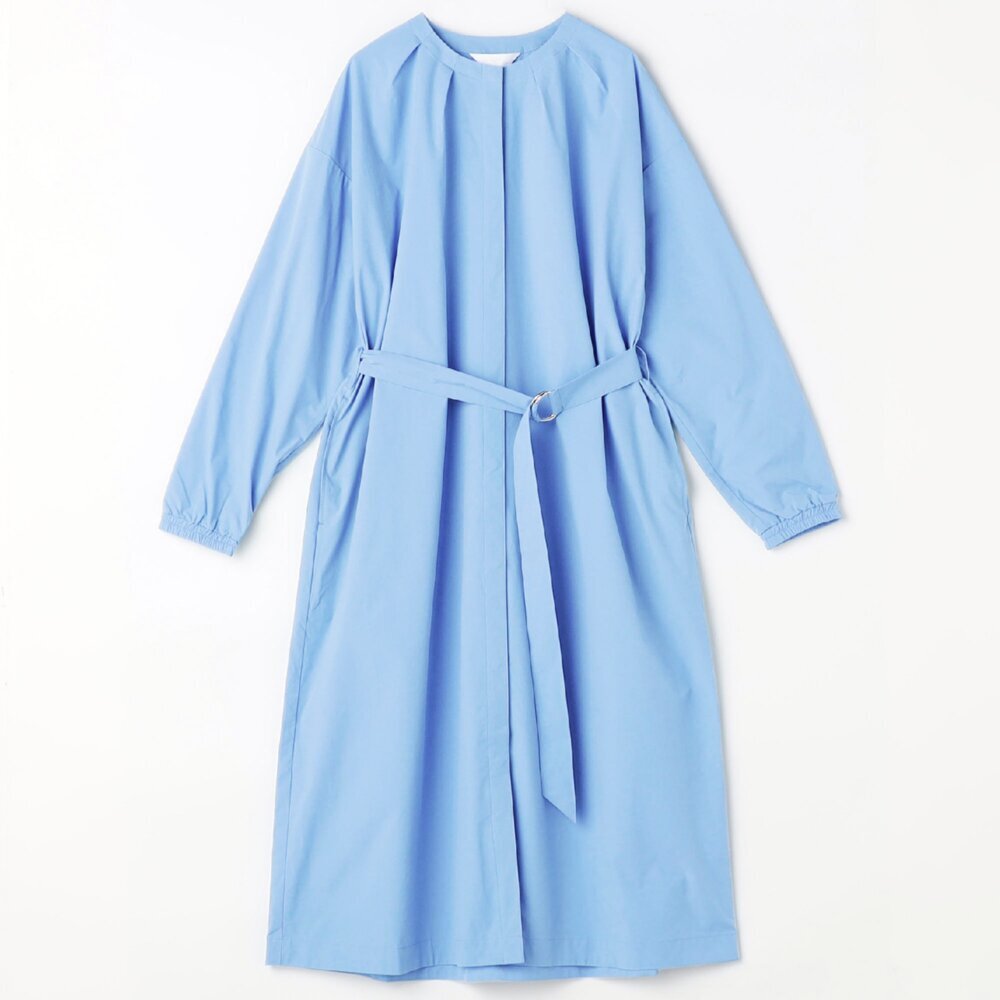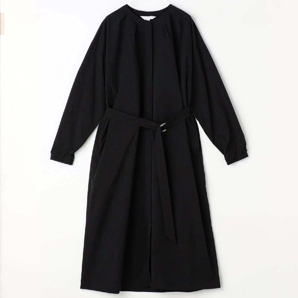 20洗耐久撥水素材を使ったノーカラーのワンピースコート。ベルトを付けてコートとして使ったり、ベルトを外して前を開けて羽織ったり、またワンピースとしても着用出来ます。布帛素材なので着用感も軽く、肌寒い時期から使える1枚です。