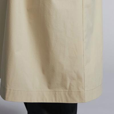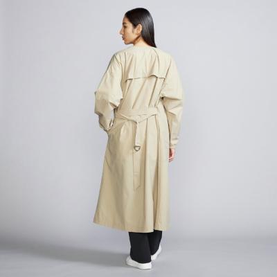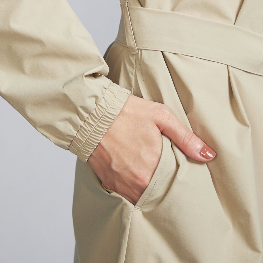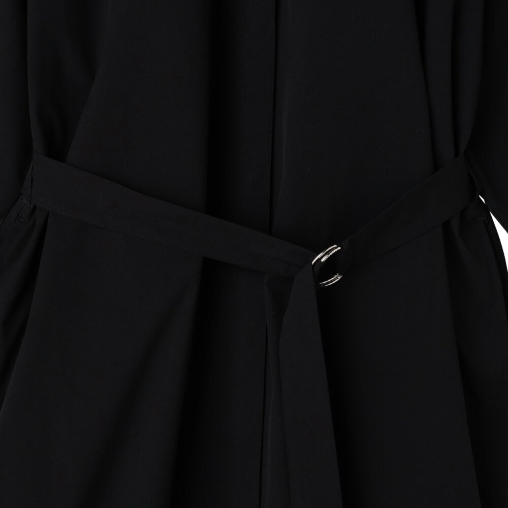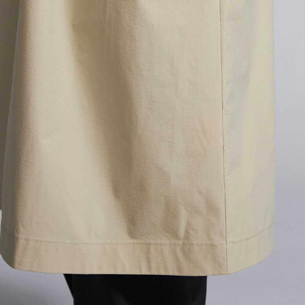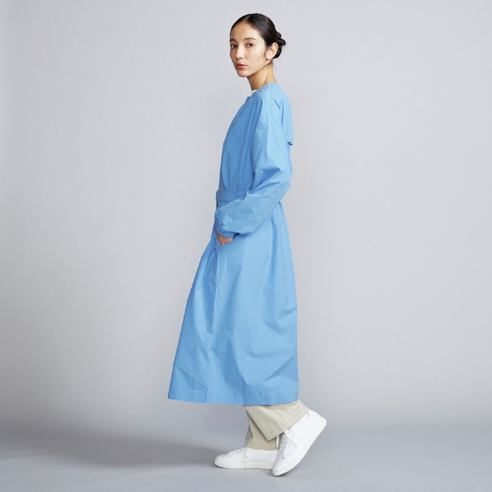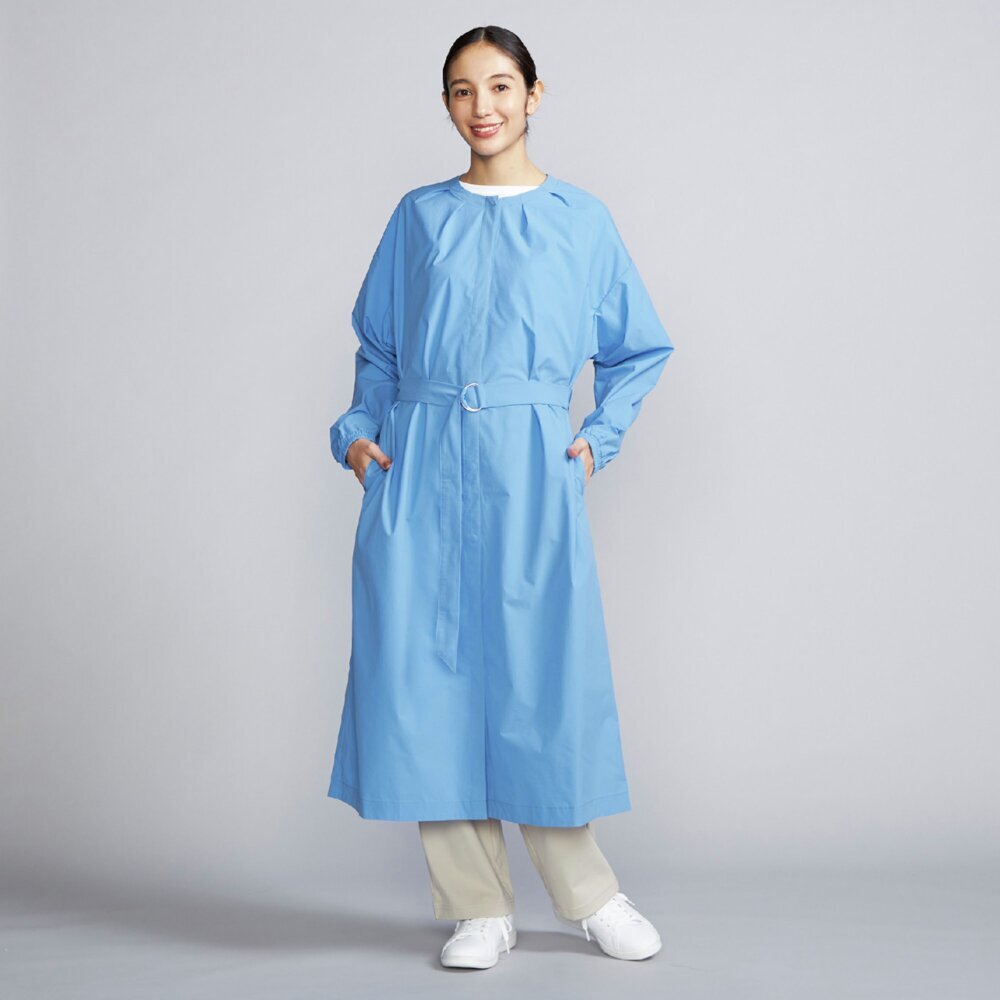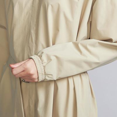 20洗耐久撥水素材を使ったノーカラーのワンピースコート。ベルトを付けてコートとして使ったり、ベルトを外して前を開けて羽織ったり、またワンピースとしても着用出来ます。布帛素材なので着用感も軽く、肌寒い時期から使える1枚です。