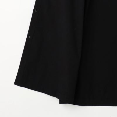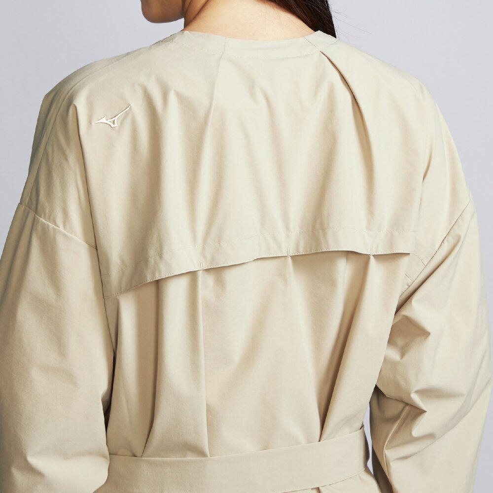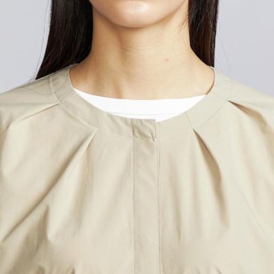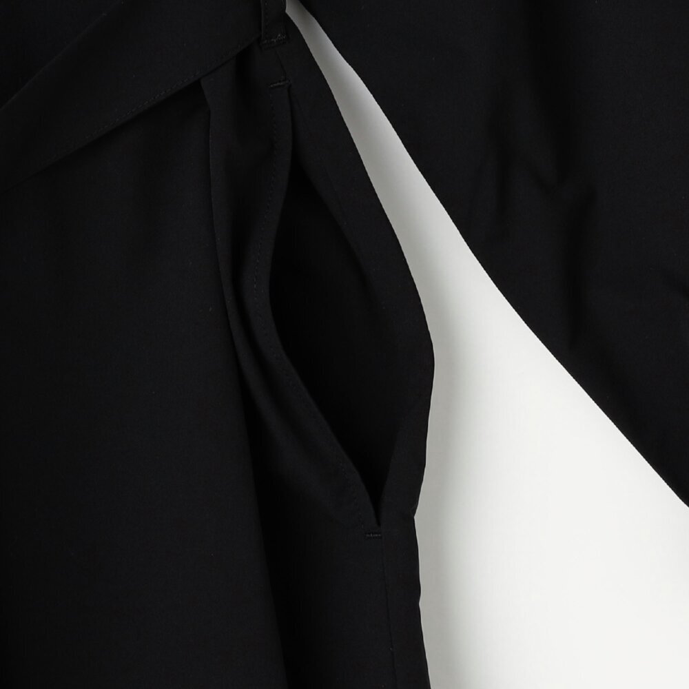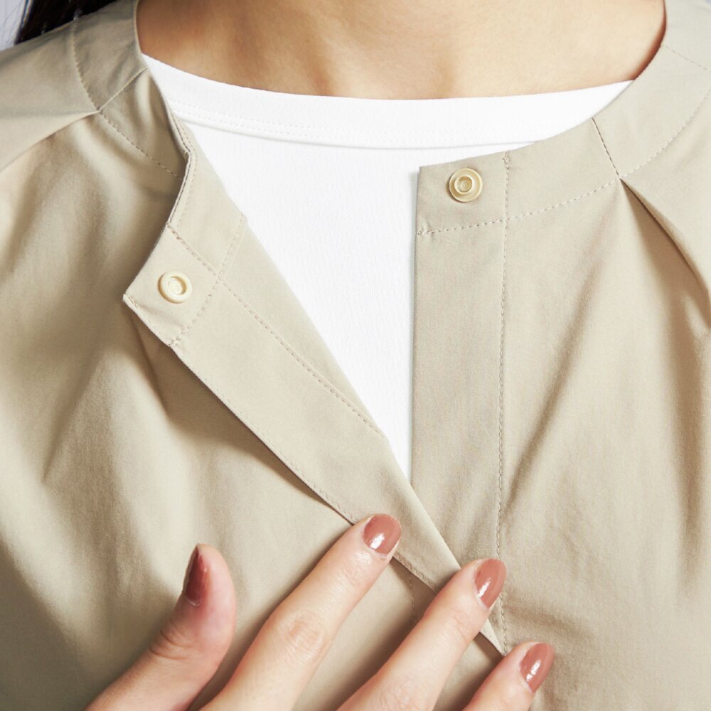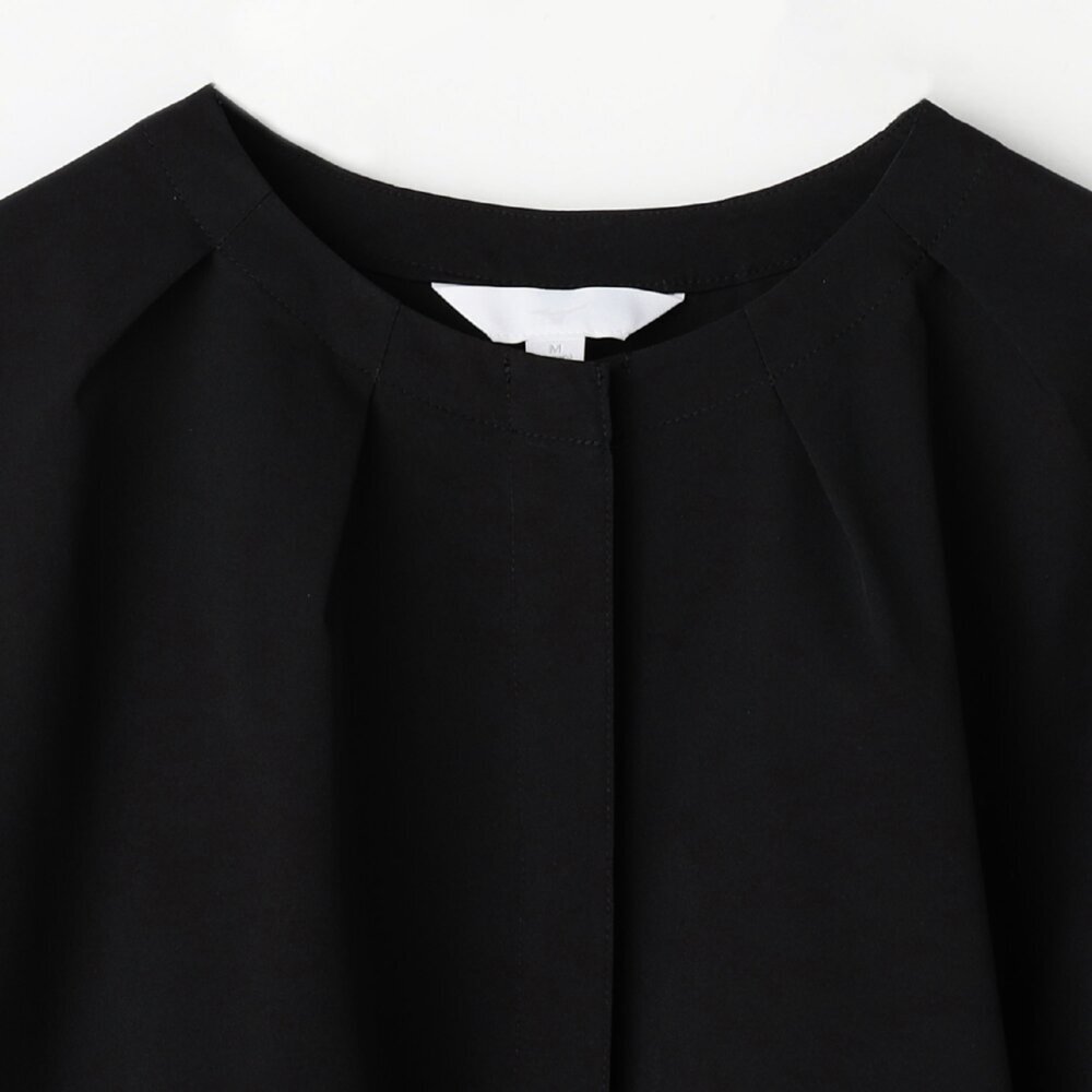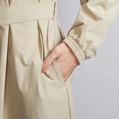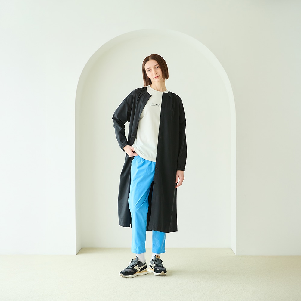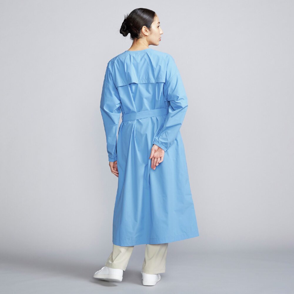 20洗耐久撥水素材を使ったノーカラーのワンピースコート。ベルトを付けてコートとして使ったり、ベルトを外して前を開けて羽織ったり、またワンピースとしても着用出来ます。布帛素材なので着用感も軽く、肌寒い時期から使える1枚です。