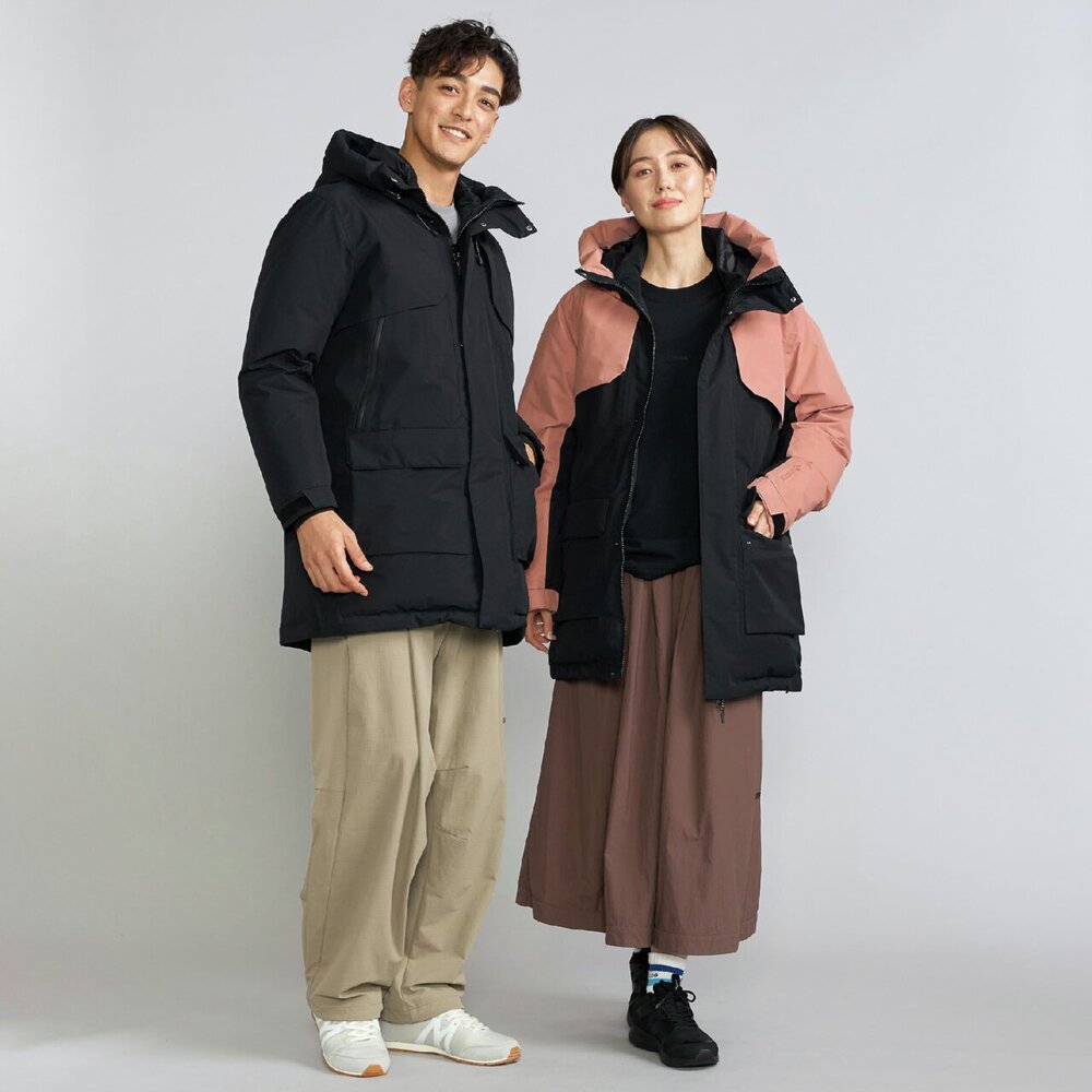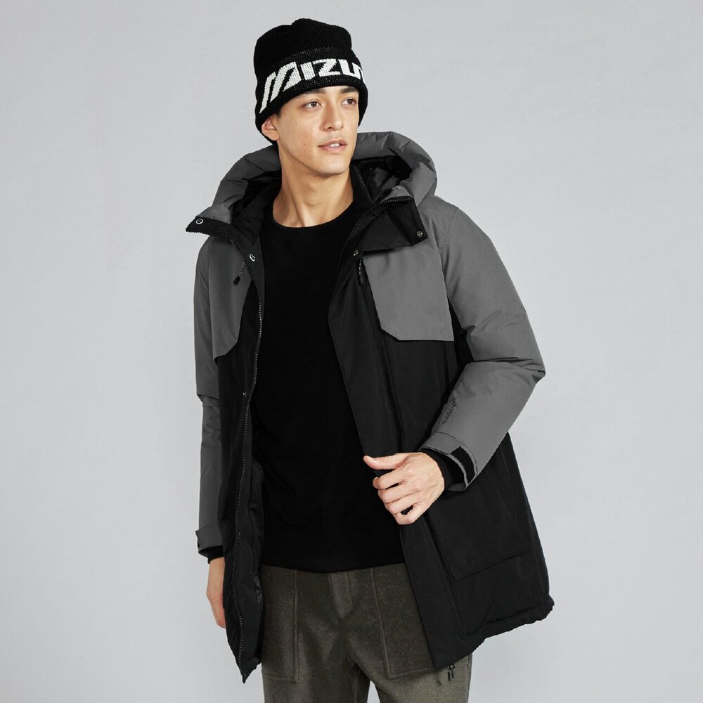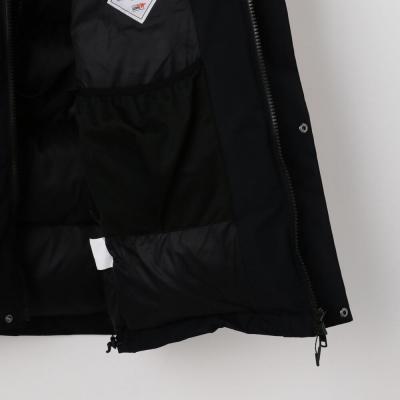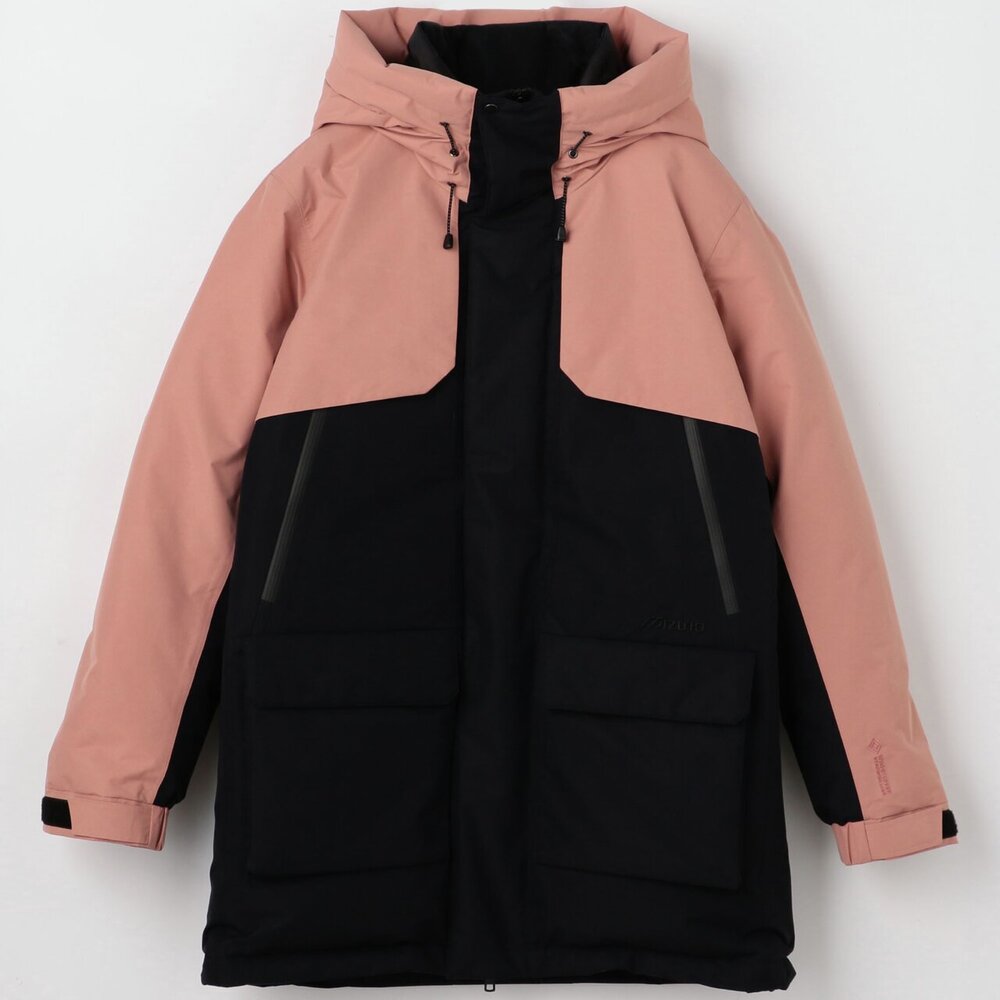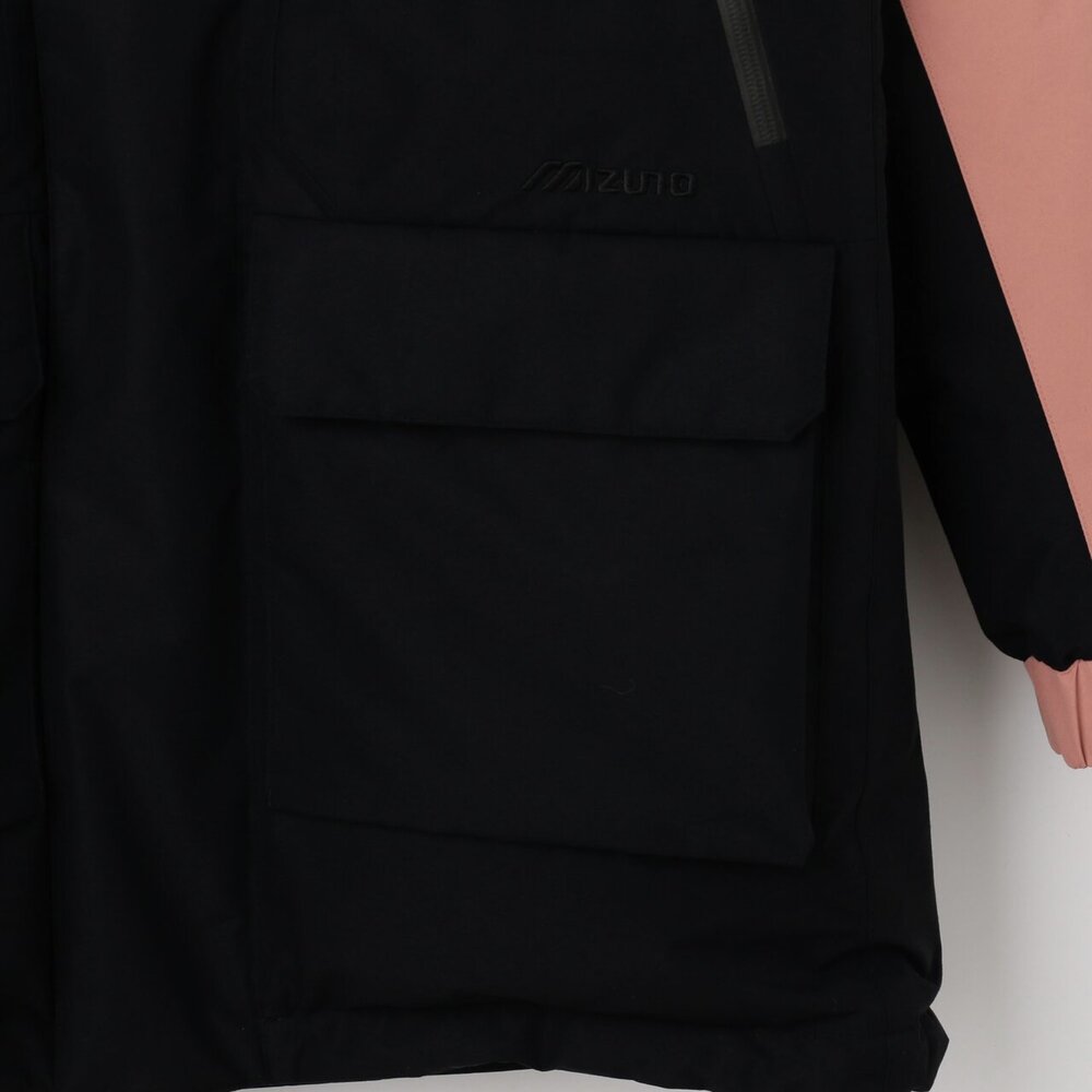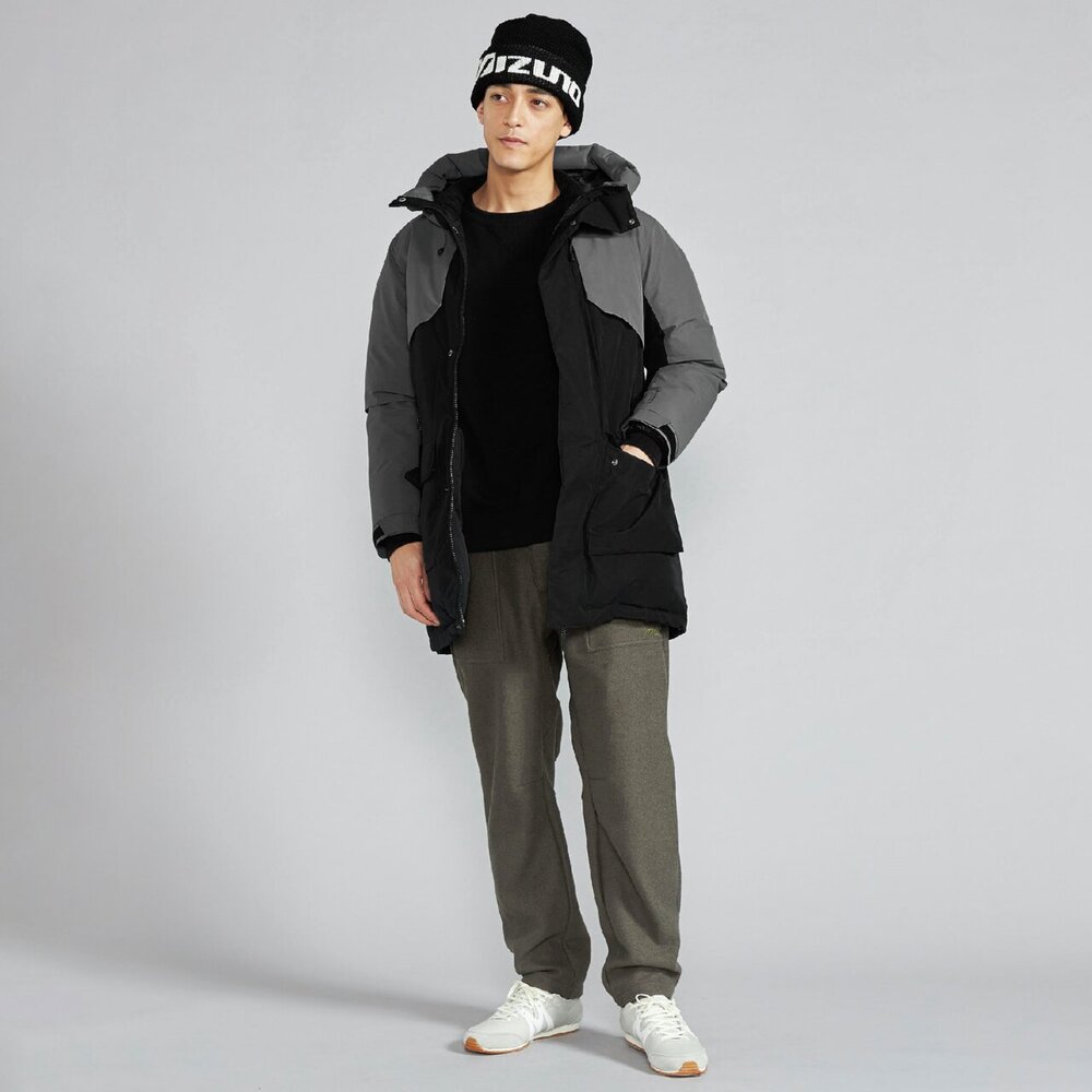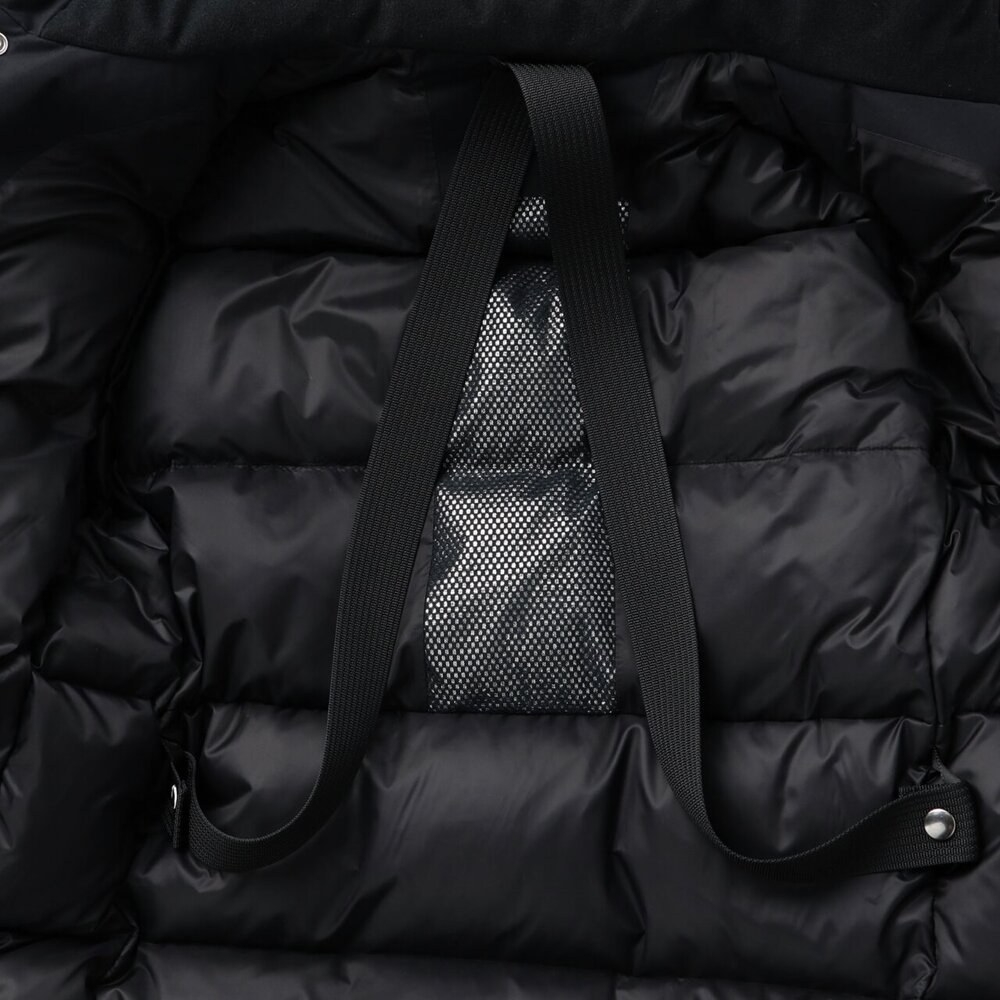 | 素材 | 表地:ポリエステル100% 裏地、本体:ナイロン100% メッシュ部:ポリエステル100% 中綿、本体:ダウン90%、フェザー10% 前立、ポケットフラップ、内衿:ポリエステル100% インナーカフス部:ポリエステル100% 後身頃上部芯地:合成繊維(ブレスサーモ)65%、ナイロン35% |