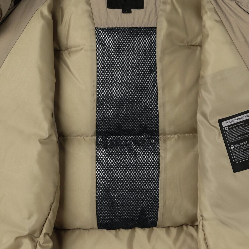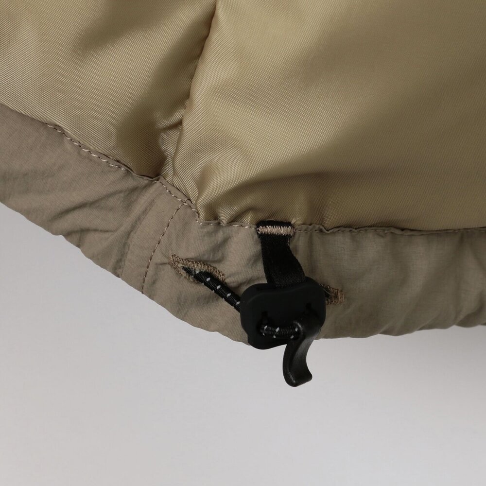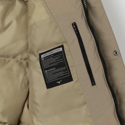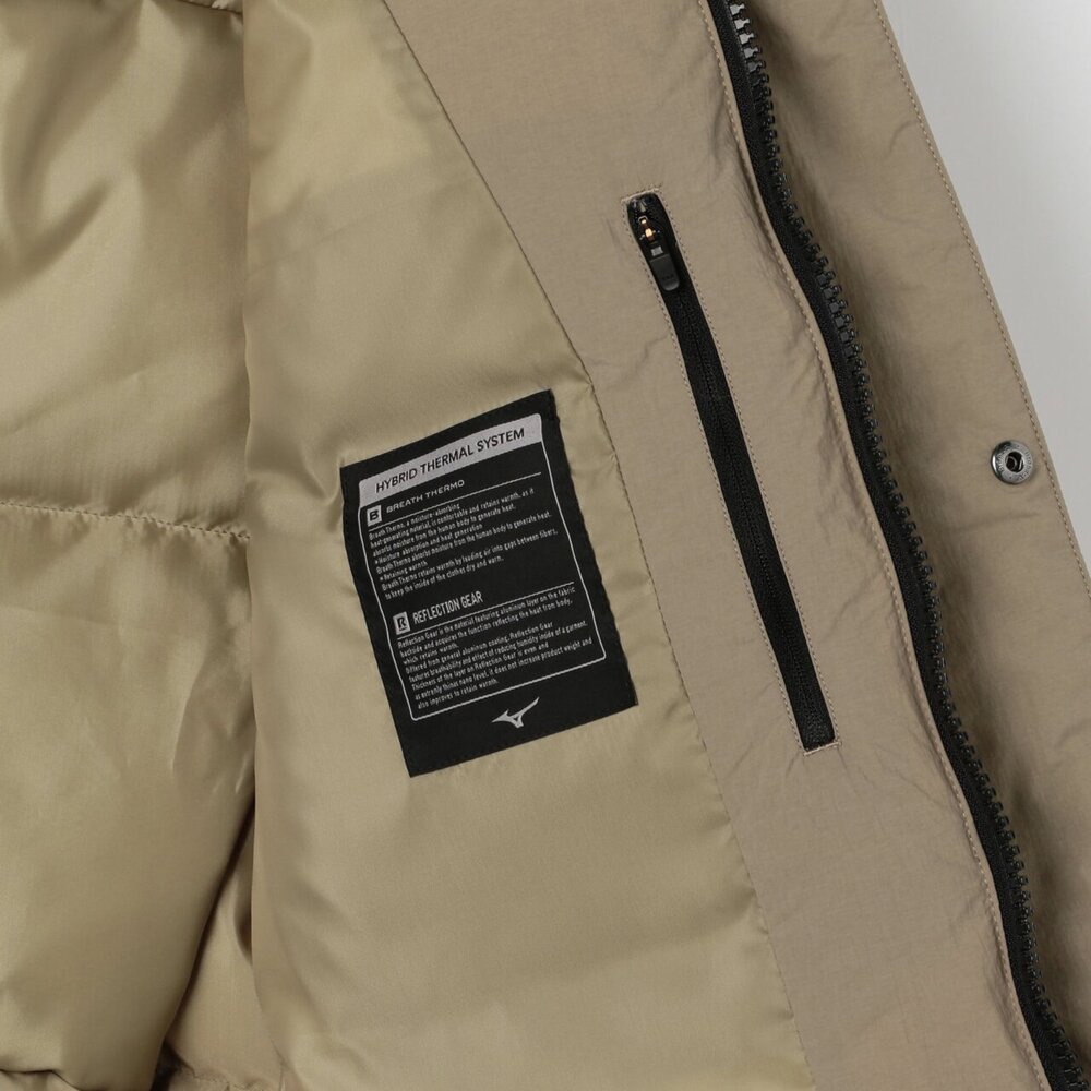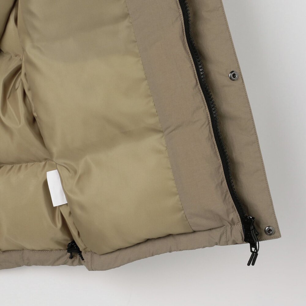 | 素材 | 表地 本体:ナイロン100% 内衿:ポリエステル100% 裏地:ポリエステル100% 中綿 本体:ダウン90%、フェザー10% 前立:ポリエステル100% 身頃上部芯地:合成繊維(ブレスサーモ)65%、ナイロン35% |