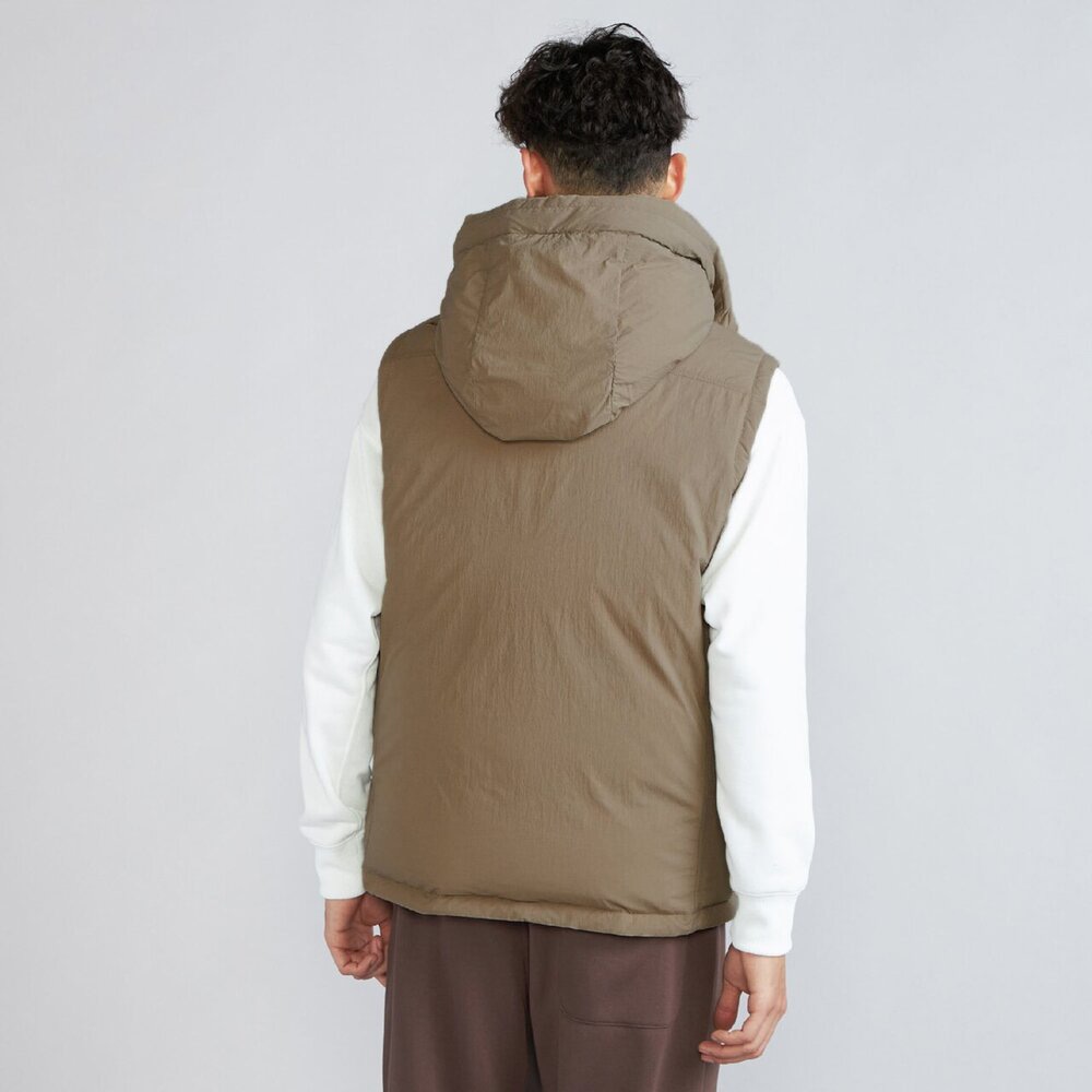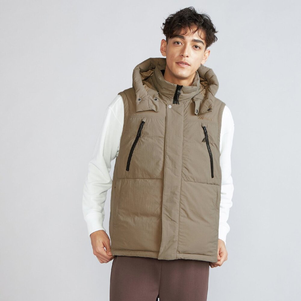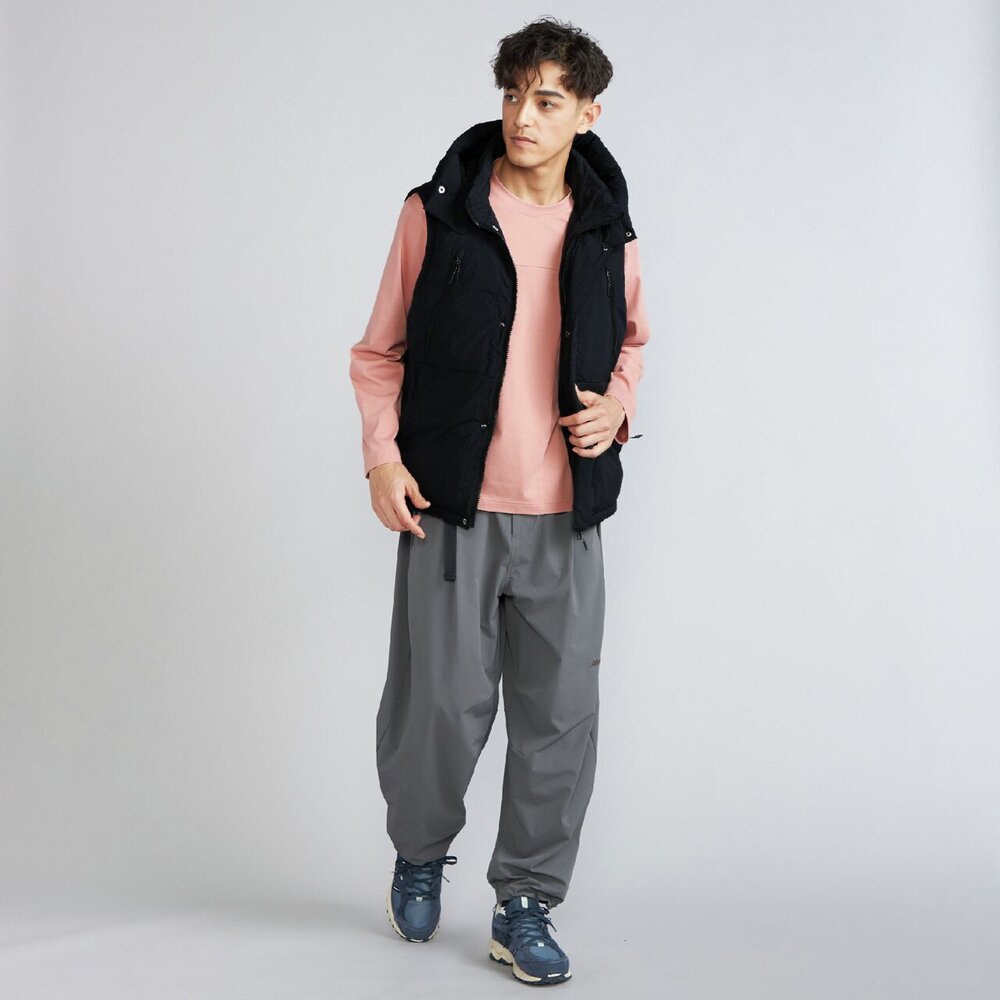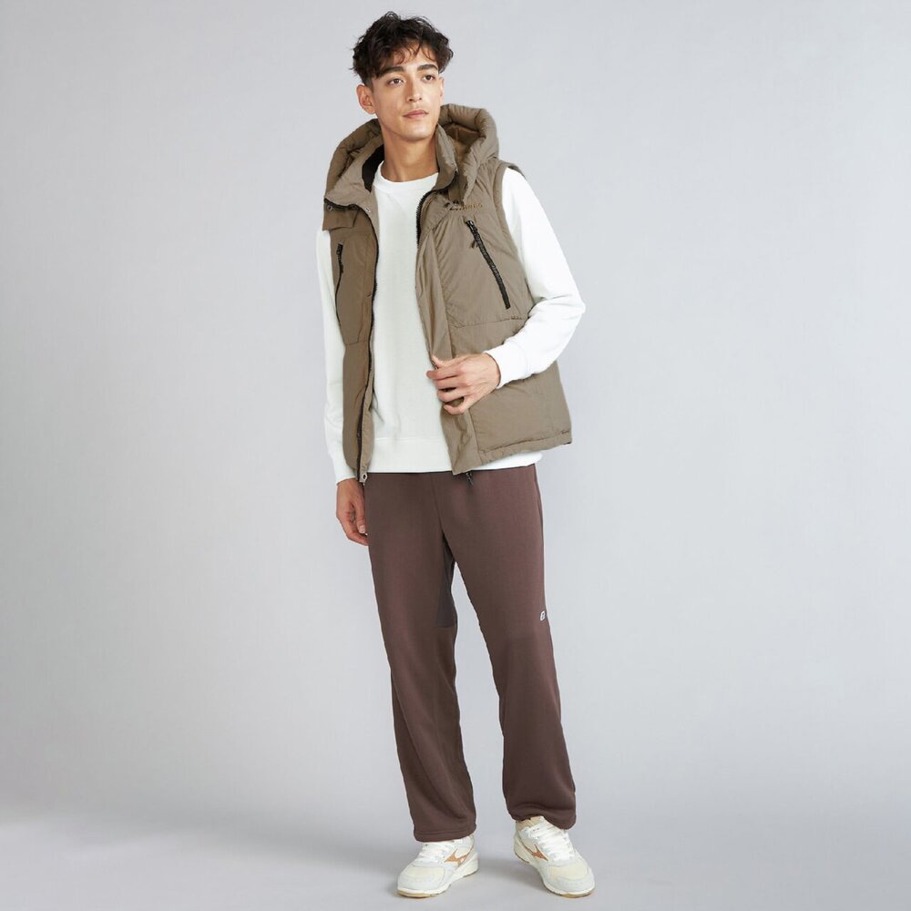ダウンベストは、中に着るアイテムで気温に合わせたスタイリングができるので、暖冬にも強いワードローブになります。