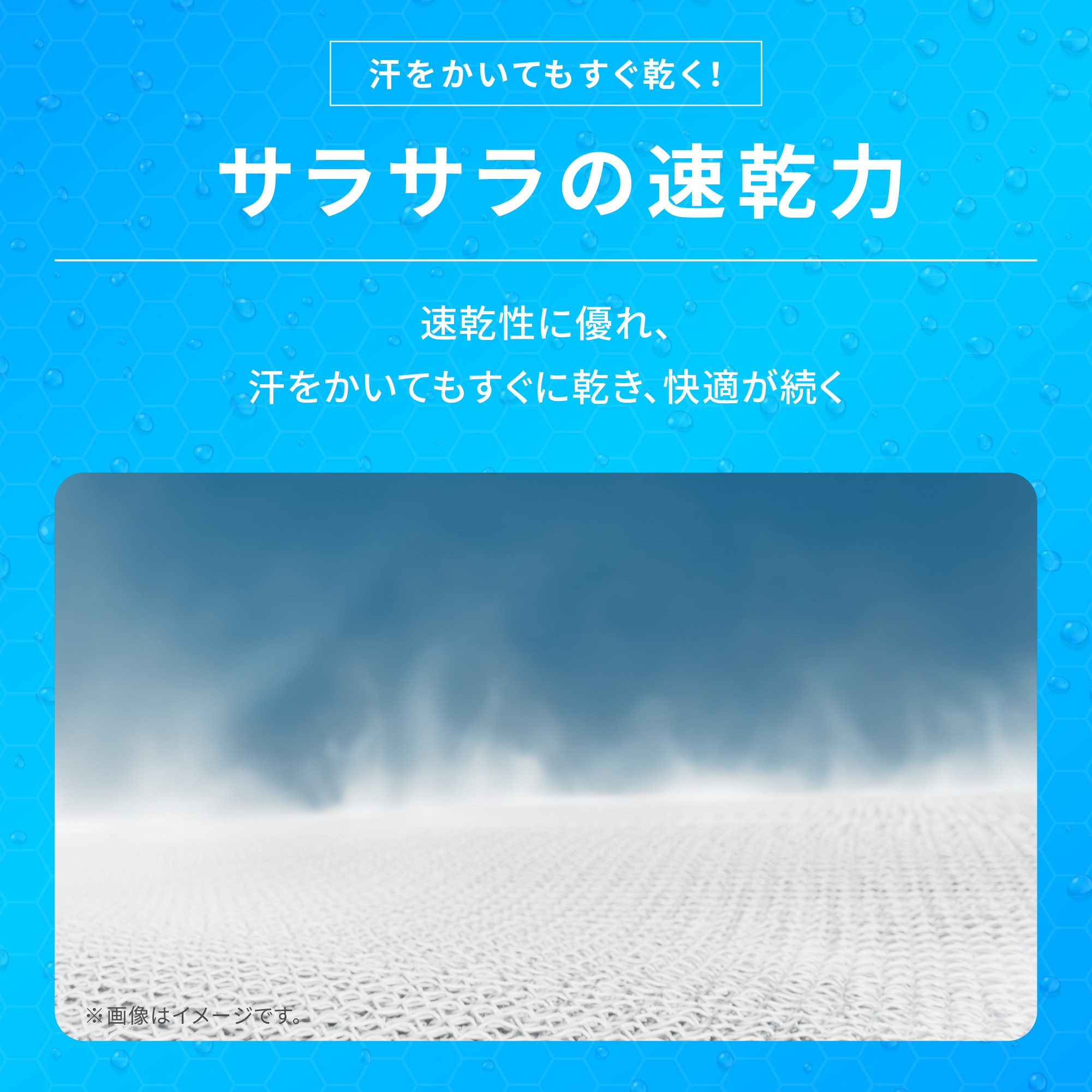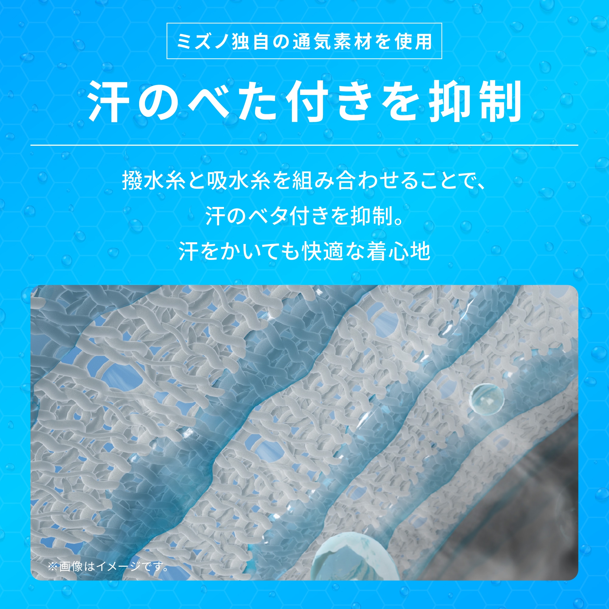 トップアスリートも使用する高通気・軽量素材、ドライエアロフローを使用、べたつき・汗ジミ防止、吸汗速乾機能で汗の不快を一枚で吹き飛ばします。