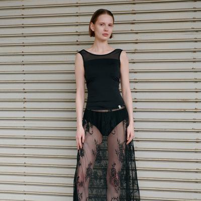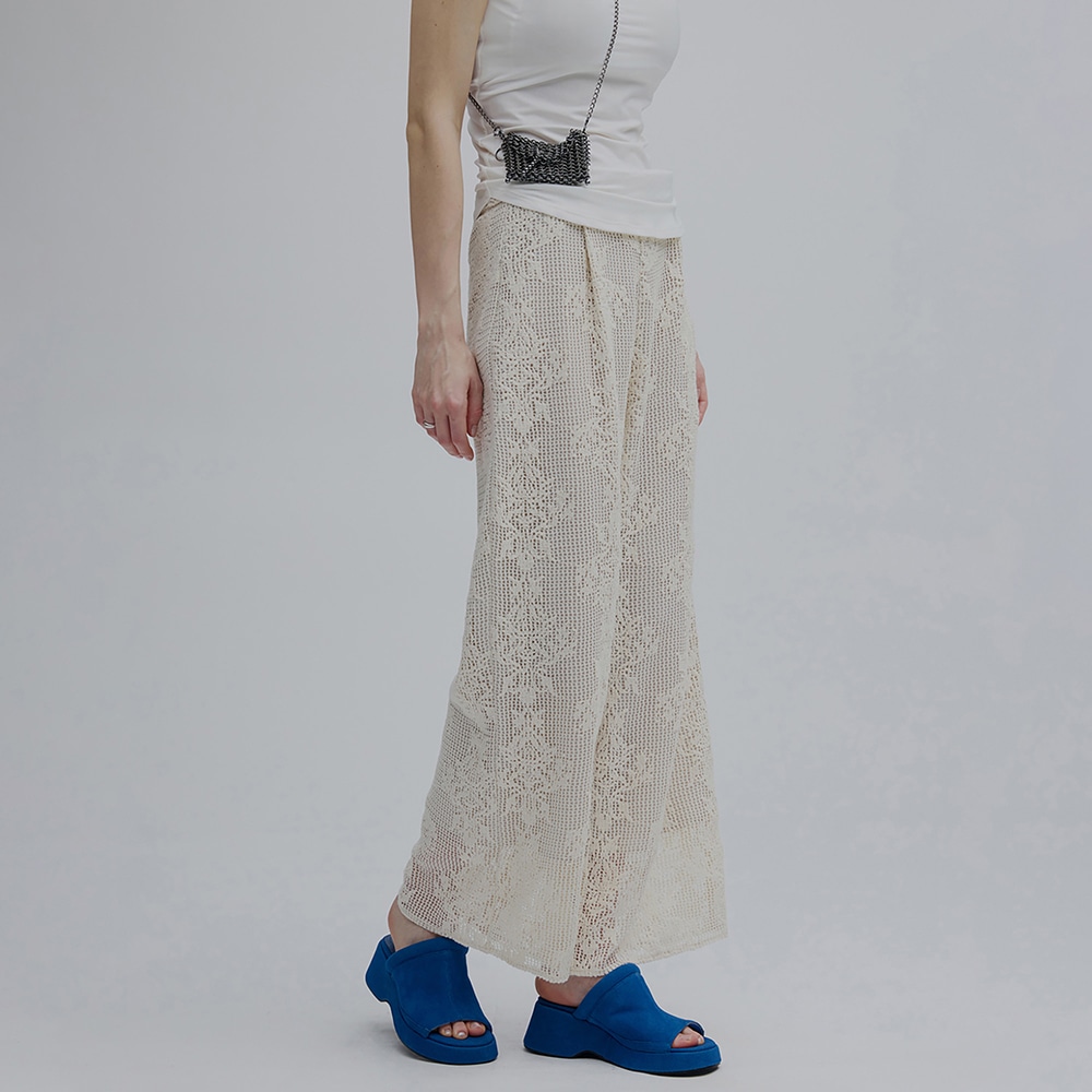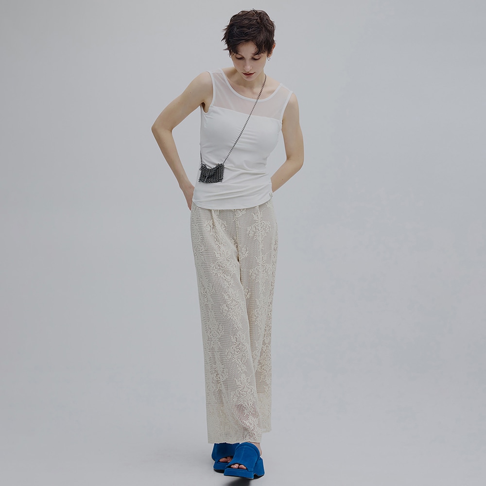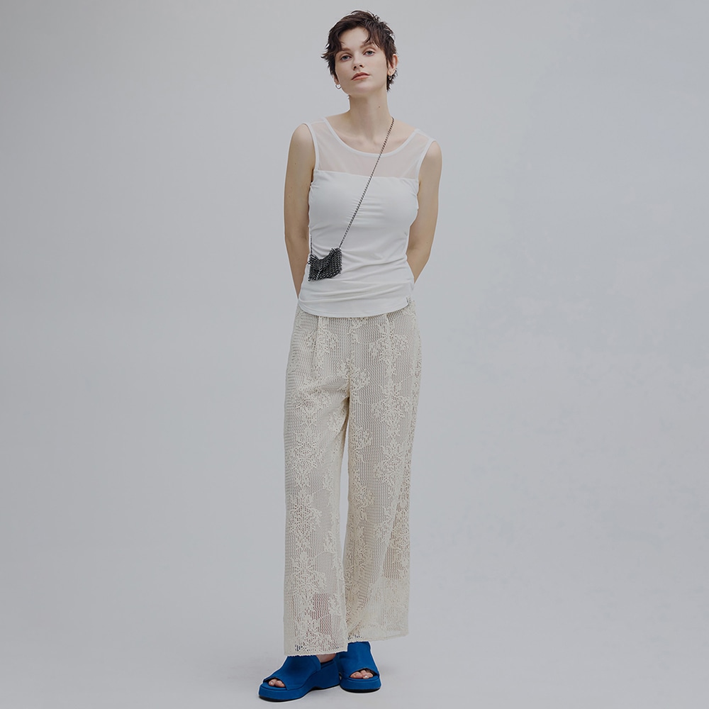 デコルテ部分は異素材のシアー素材とドッキングし抜け感のある一着。