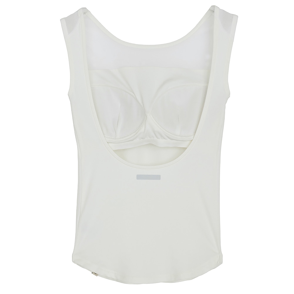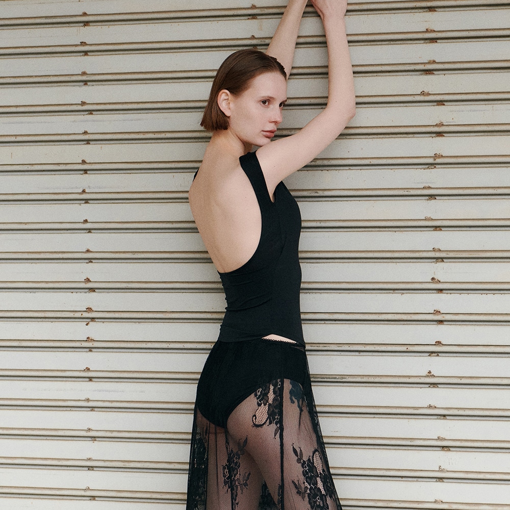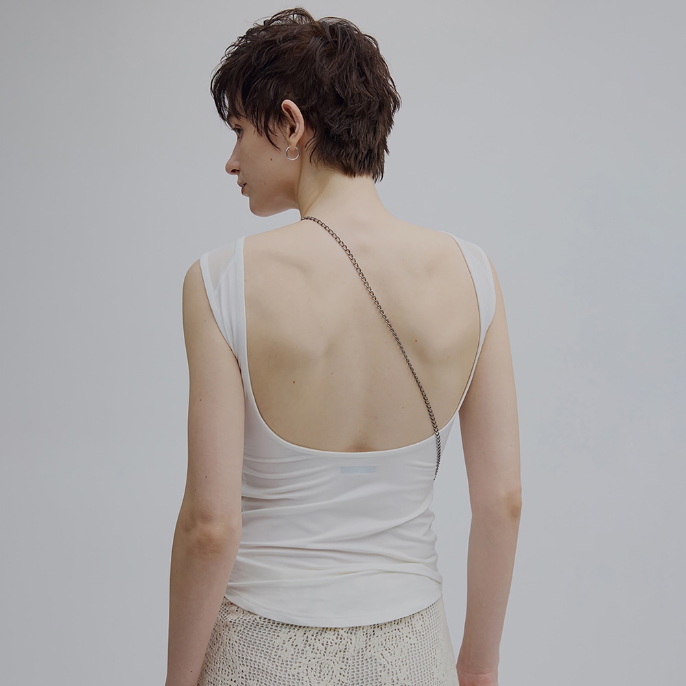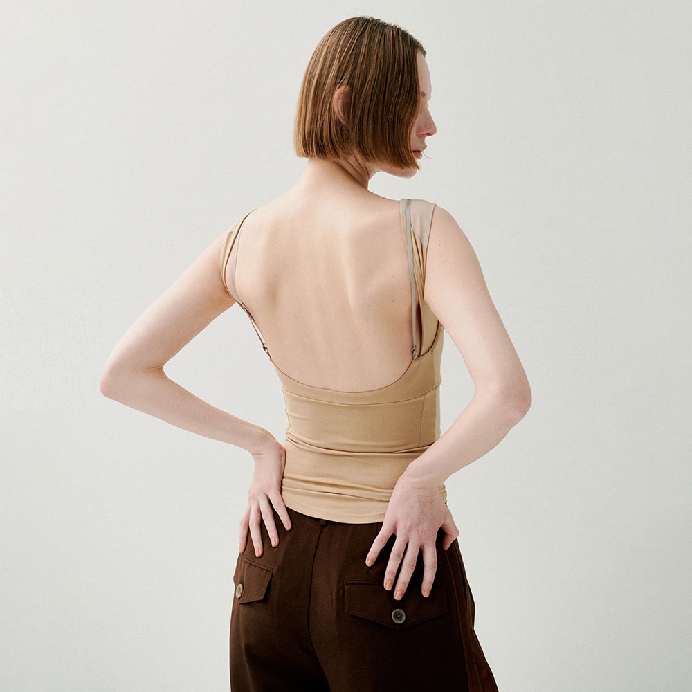 背中を最大限まで広く開けることで、バックオープンのアイテムとも着用可能なデザイン。