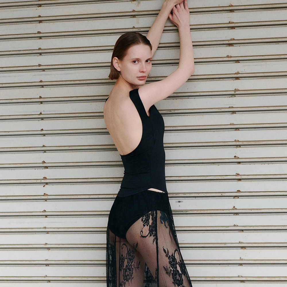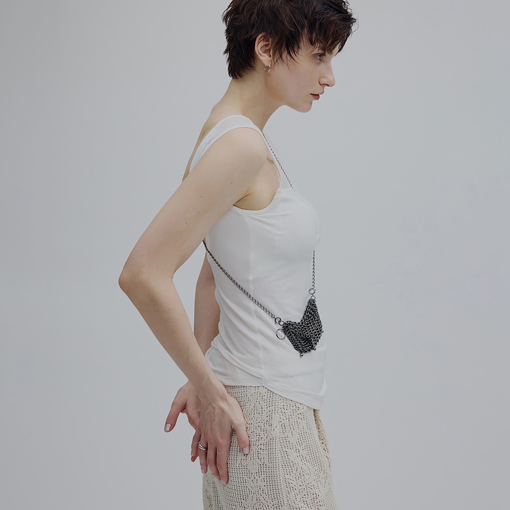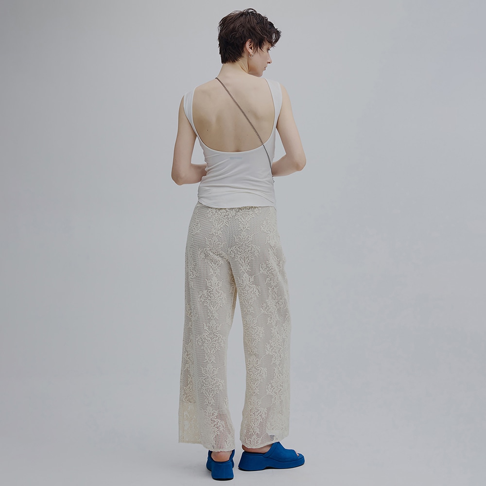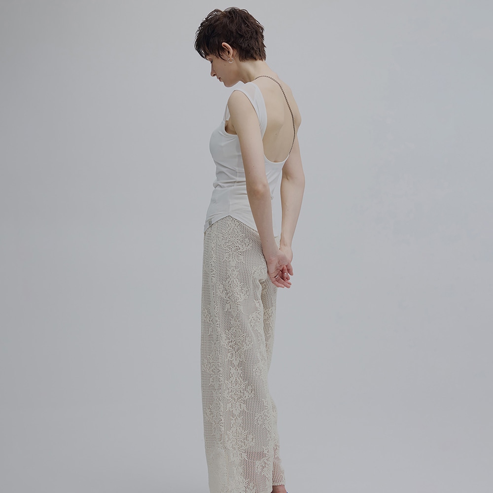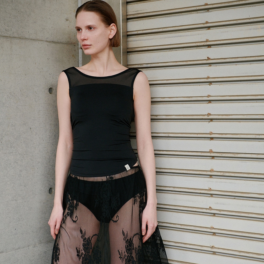 背中を最大限まで広く開けることで、バックオープンのアイテムとも着用可能なデザイン。