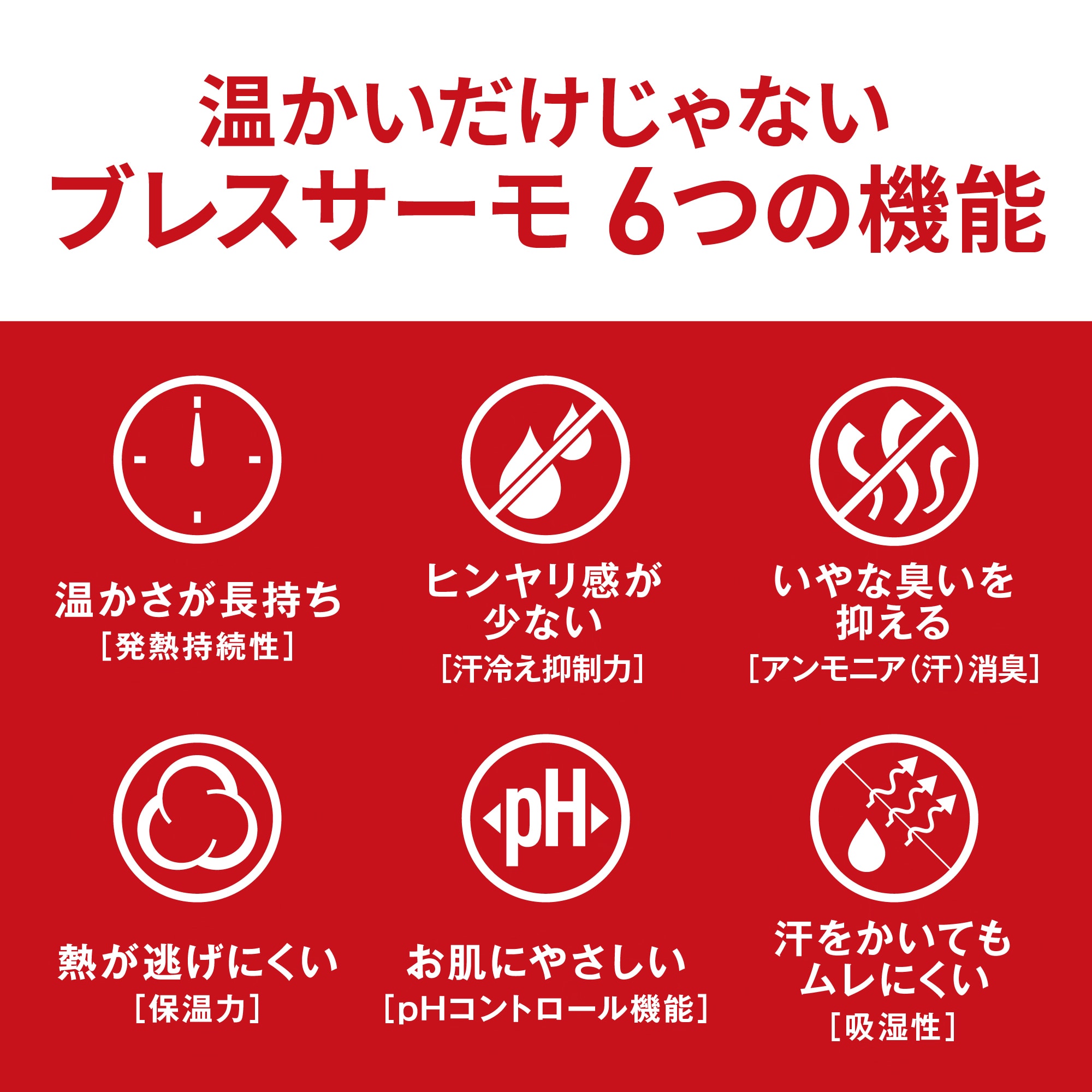 吸湿発熱素材「ブレスサーモ」は、人体から発生する水分を吸収して発熱効果をもたらす新しい保温メカニズムを実現させました。ブレスサーモの吸湿発熱した空気を繊維間に取りこみ保温する為、衣服内をドライで温かな状態にします。
